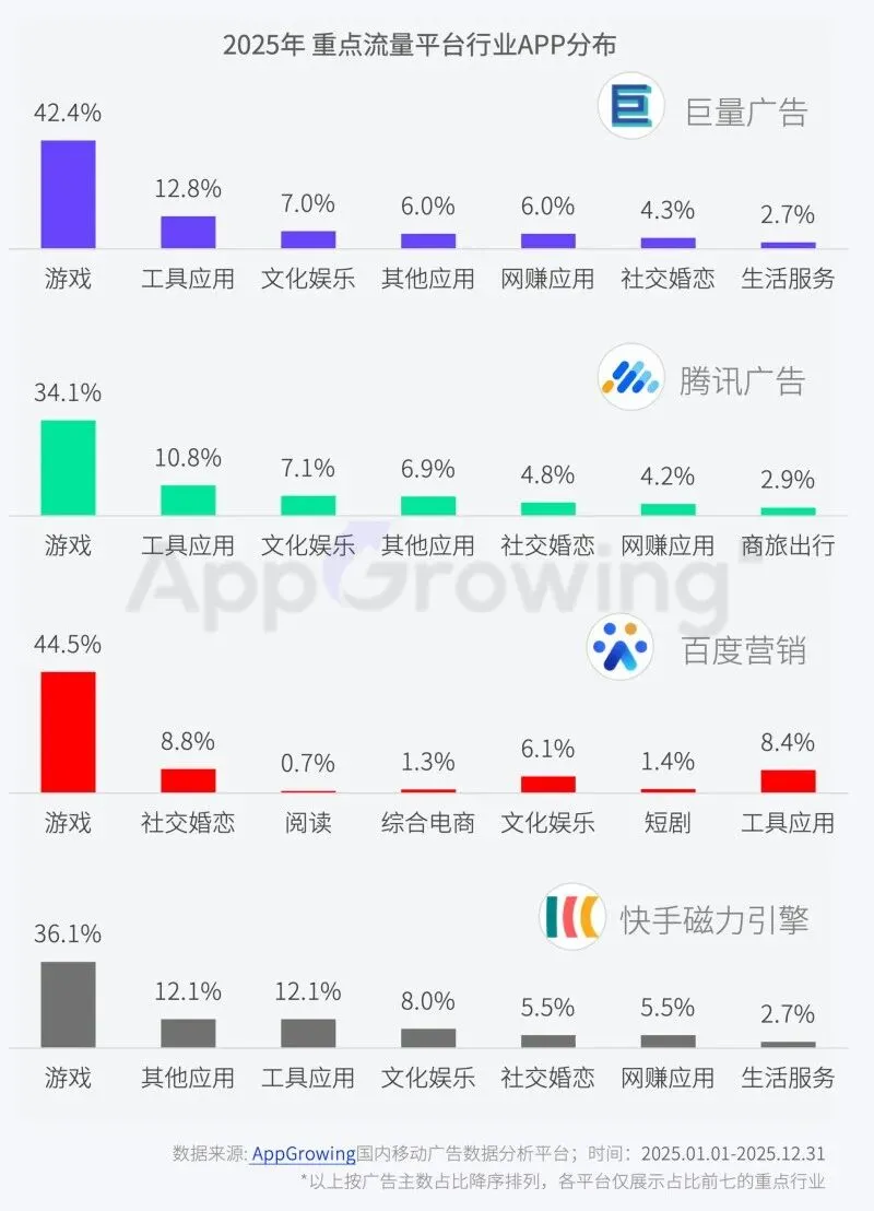 平台投放格局凸显行业与流量场景的深度绑定,巨量、腾讯、百度、快手分别依托生态优势,成为社交婚恋、综合电商、游戏、工具应用等行业的核心投放阵地。