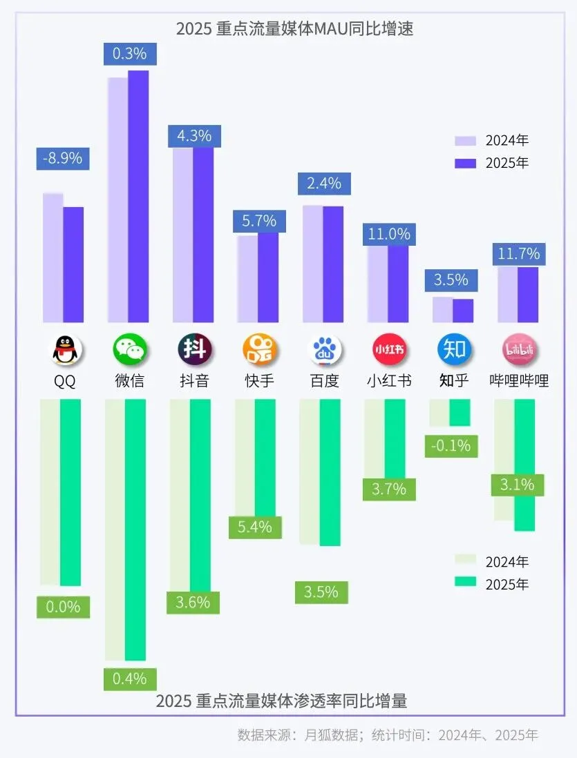 微信、抖音等超级 APP MAU 增速微增,但渗透率持续提升,反映存量市场下厂商深耕用户粘性的成效;小红书、B 站等垂类平台 MAU 与渗透率双增,反映出内容垂直化、圈层化的营销趋势。
