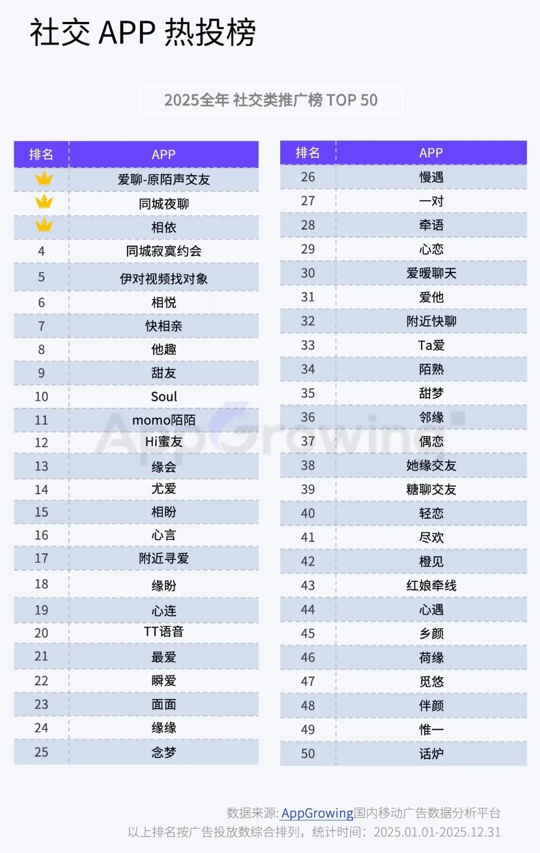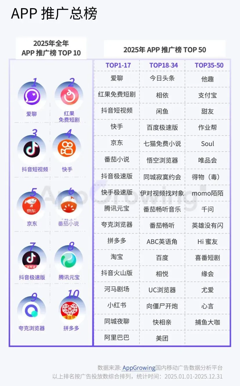 聚焦到2025年推广榜,爱聊仍稳居榜首,红果免费短剧时隔一年从第4名上升到第2名。腾讯元宝、夸克浏览器势不可挡,强势进入 TOP10 队列。