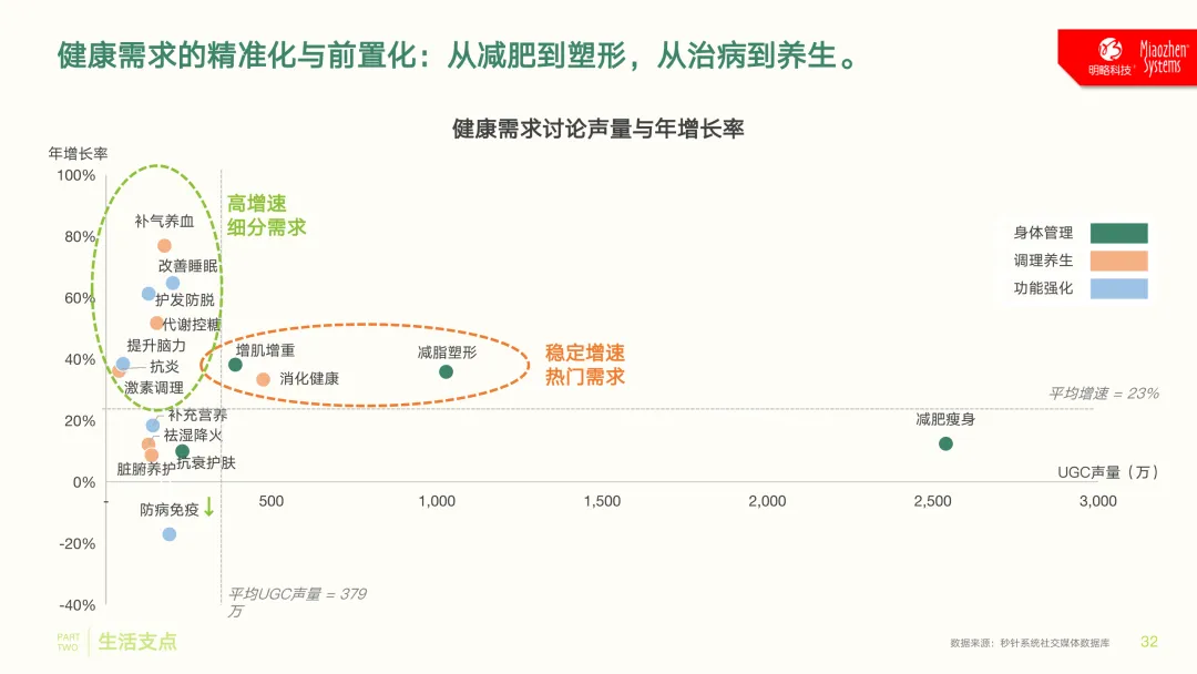 健康意识步入“主体性觉醒”的新阶段,身体不再是被动接受改造的战场,而是灵魂的温润居所。报告显示,健康需求正变得极度精准化与前置化,补气养血、代谢控糖、抗炎等细分领域的话题热度呈现爆发式增长。消费者不再盲从于单一的审美模板,而是开始制定属于自己的规则。