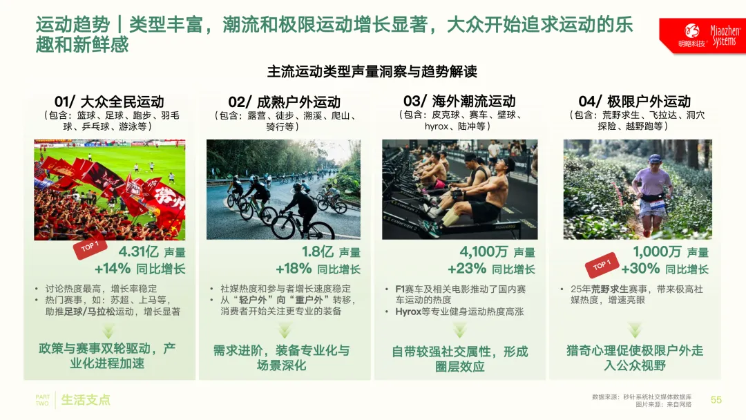 2025年,中国经常参与体育锻炼的人数超5.5亿,运动已从“竞技”进阶为“生活方式”。社区“15分钟健身圈”覆盖率超90%,68%的人认为运动提升了幸福感。从“苏超”的全民狂欢,到硬核户外徒步,再到Hyrox等潮流运动,运动正成为新型社交货币。