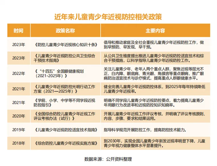 近年来国家出台多项眼健康相关政策,采取多项措施引导儿童青少年近视防控。2024年《近视防治指南》经国家卫健委重新修订后重磅发布,为进一步提高近视防控和诊疗的规范化水平,推动和加强我国近视防治工作。