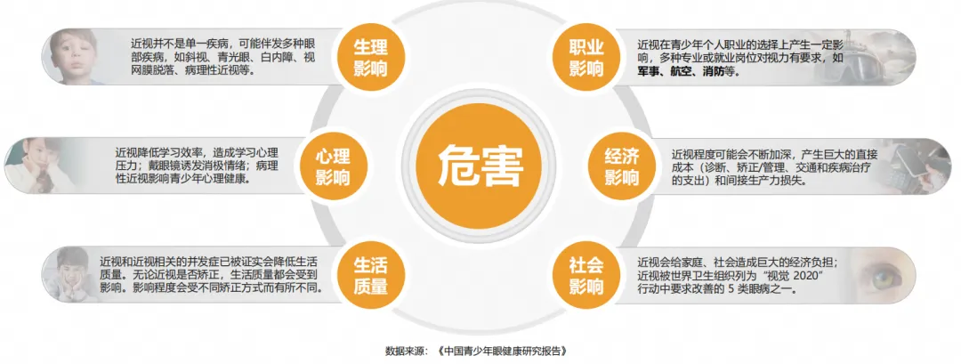 近视并不是单一疾病,可能伴发多种眼部疾病,严重影响人们生理健康;除了生理影响以外,近视还会对心理、职业、生活质量、经济社会等多方面造成影响。