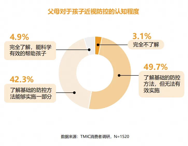 调研显示,绝大多数父母仅了解基础的近视防控知识,并且无法科学地帮助孩子进行有效的近视预防控制。家长缺乏足够的防控意识和知识储备是影响孩子近视防治意愿和行为的重要因素。