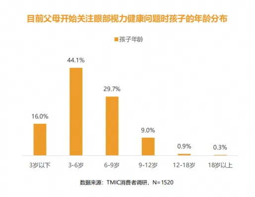 调研显示,超过40%的父母会在孩子3-6岁期间开始关注孩子的眼部视力健康问题。专家指出,儿童学龄前时预防近视第一阶段,6-12岁是近视的发展期,屈光进展速度快,是近视防控的黄金期。