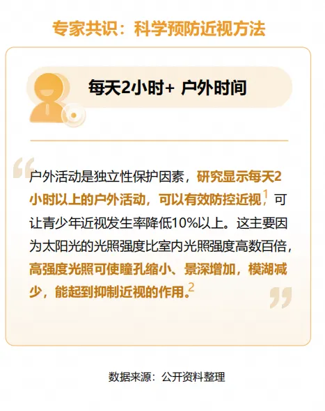 在近视预防阶段,减少电子产品的使用、培养用眼习惯是家长通常采取的预防措施。研究表明,户外运动时间是近视的强相关因素,每天2小时以上的户外活动可以大大降低孩子近视的概率。