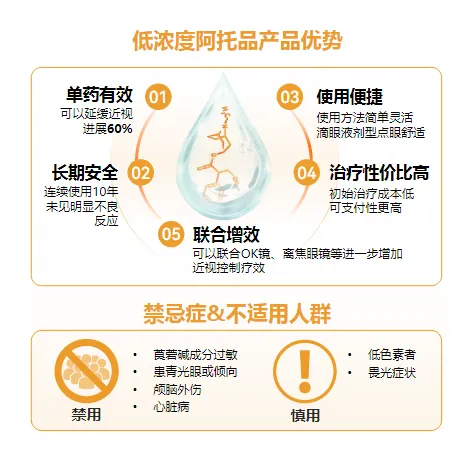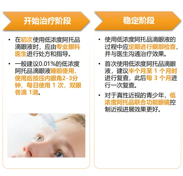 低浓度阿托品滴眼液是经过循证医学验证能够有效延缓近视进展的药物,与各种特殊设计的眼镜及接触镜联合应用苟能增强近视控制的效果。低浓度阿托品滴眼液需要在专业医生指导下规范使用,遵医嘱定期随访。