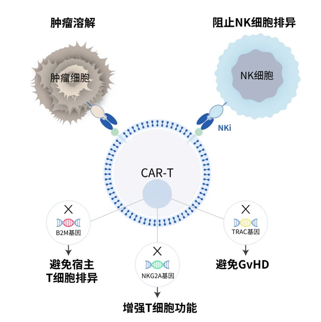 通用型的 CAR-T 技术普遍存在的问题是宿主抗移植物反应。为了避免宿主 T 细胞对于同种异体 CAR-T 细胞的排异,通常会敲除 B2M 基因。但是,缺乏 B2M 基因的同种异体 CAR-T细胞会被宿主的 NK 细胞排异,导致同种异体 CAR-T 细胞的增殖和持久性降低。为了解决这个问题,公司研发了THANK(Target to Hinder the Attack of NK细胞)-uCAR®技术,将一种识别 NK 细胞表面蛋白-NKG2A 的 CAR 被装载到同种异体 CAR-T 细胞中,用来阻止宿主 NK 细胞的攻击,增强CAR-T细胞的增殖和持久性。临床前数据表明,在 NK 细胞存在的情况下,THANK-uCAR T细胞比 TCR/B2M 双除同种异体 T 细胞能更好地存活和增殖。