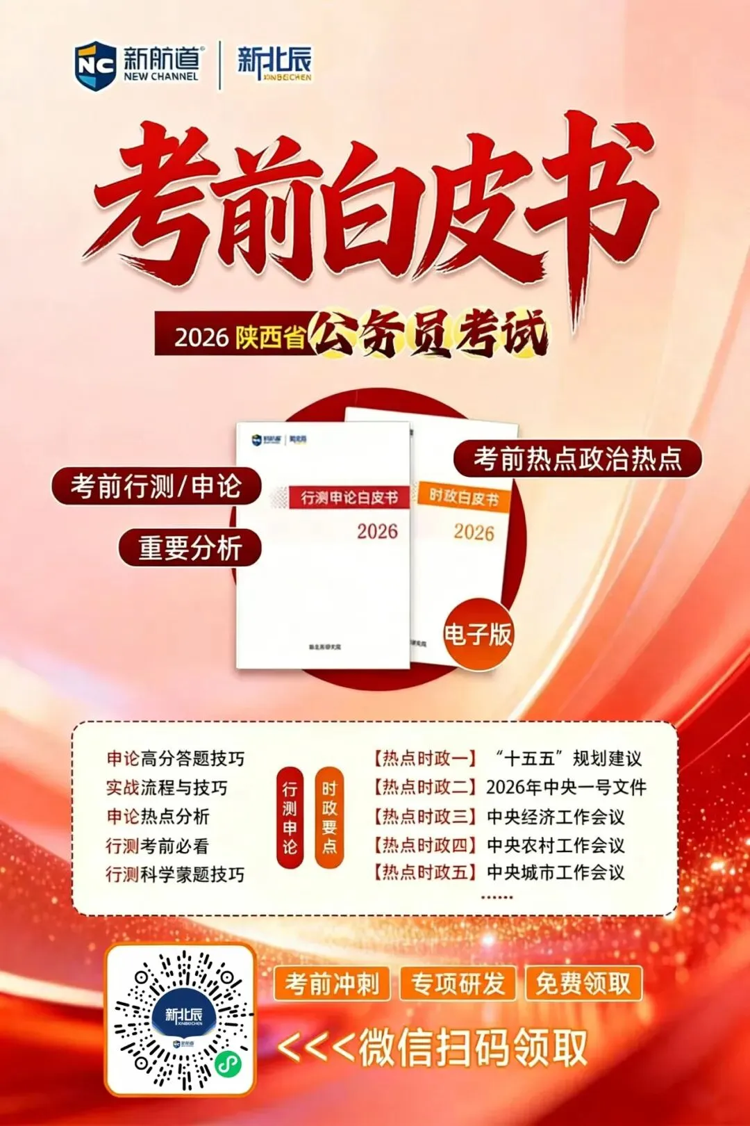 2026年陕西省公务员考试进入最后冲刺阶段!为助力考生高效备考,新航道·新北辰教研团队重磅推出《2026陕西省考考前冲刺白皮书》电子版,免费领取!包含行测/申论高频考点深度剖析与时政热点汇编,考前必看!