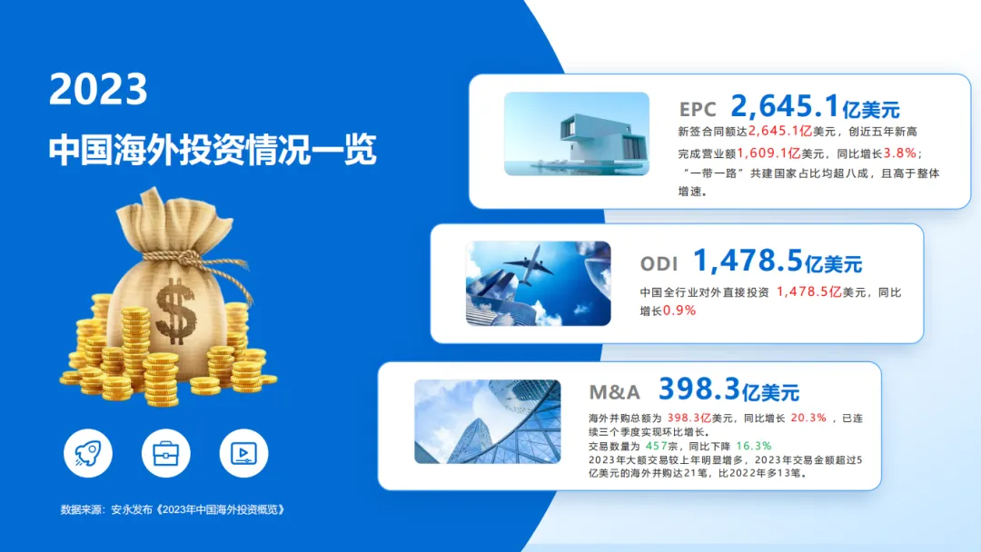 2023年中国企业出海投资表现亮眼,全行业对外直接投资478.5亿美元,同比增长0.9%;海外并购总额398.3亿美元,同比增长20.3%,大额交易(超5亿美元)达21笔。