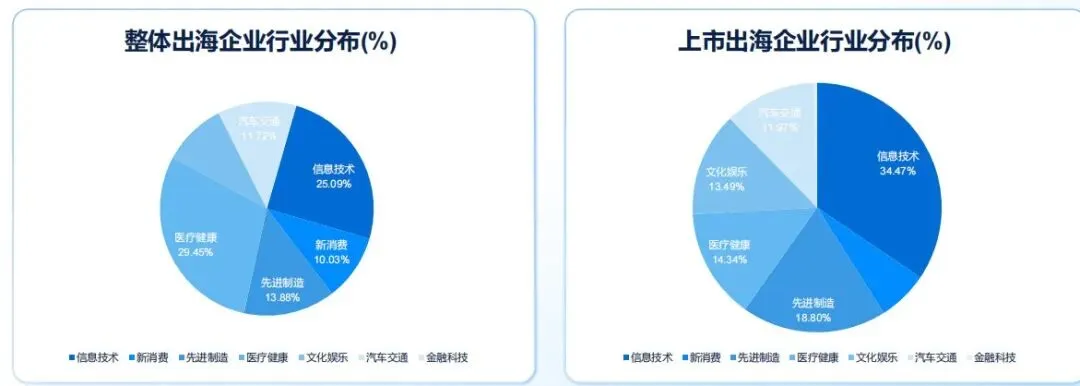 行业分布呈现“三驾马车”格局,医疗健康、信息技术、先进制造出海积极性最高,上市企业中信息技术与先进制造占比超50%。