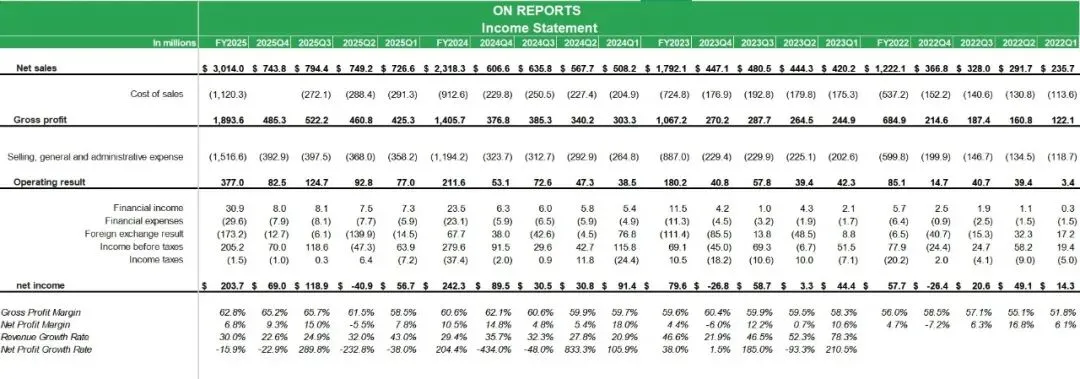 2025财年On实现净销售额30.14亿美元,同比增长30%,延续高增速轨道。毛利达18.94亿美元,毛利率提升至62.8%,较2024年的60.6%明显改善,显示产品结构升级与高端化策略持续兑现。全年营业利润3.77亿美元,营业利润率约12.5%,经营杠杆逐步释放。