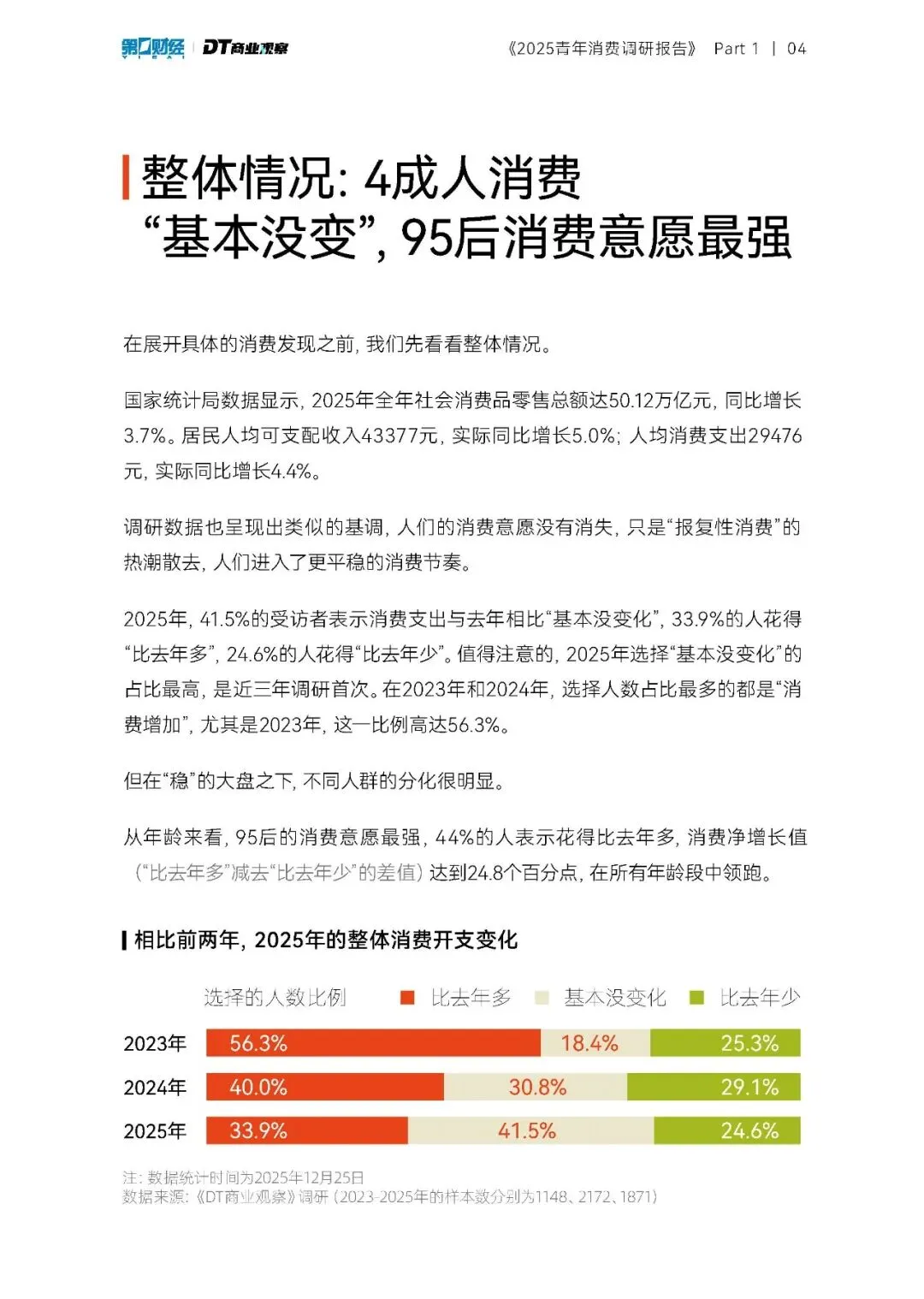 调研显示,曾经在 2023 年高达 56.3% 的消费增加比例,在 2025 年已然回落,青年消费不再盲目跟风,而是进入了稳字当头的阶段。但这份平稳之下,是鲜明的人群分化,年龄和城市线级,成为决定消费意愿的两大关键因素。