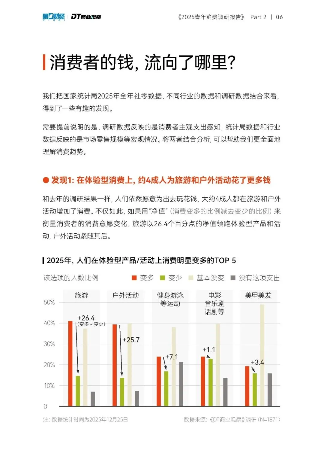 青年的钱究竟流向了哪里?答案藏在体验型消费的持续火热和实体消费的刚需回归里。约四成青年在 2025 年为旅游和户外活动增加了消费,用消费净增长值来衡量,旅游领跑体验型消费,然后是户外活动。无论是为了一场演唱会奔赴一座城,还是周末在城市周边徒步露营,走出家门的体验型消费,成为青年释放消费需求的重要出口。但并非所有体验型消费都能获得青睐,KTV、剧本杀等室内社交娱乐业态持续萎缩,青年的体验型消费选择,正在向更贴近自然、更具个性化的方向转变。