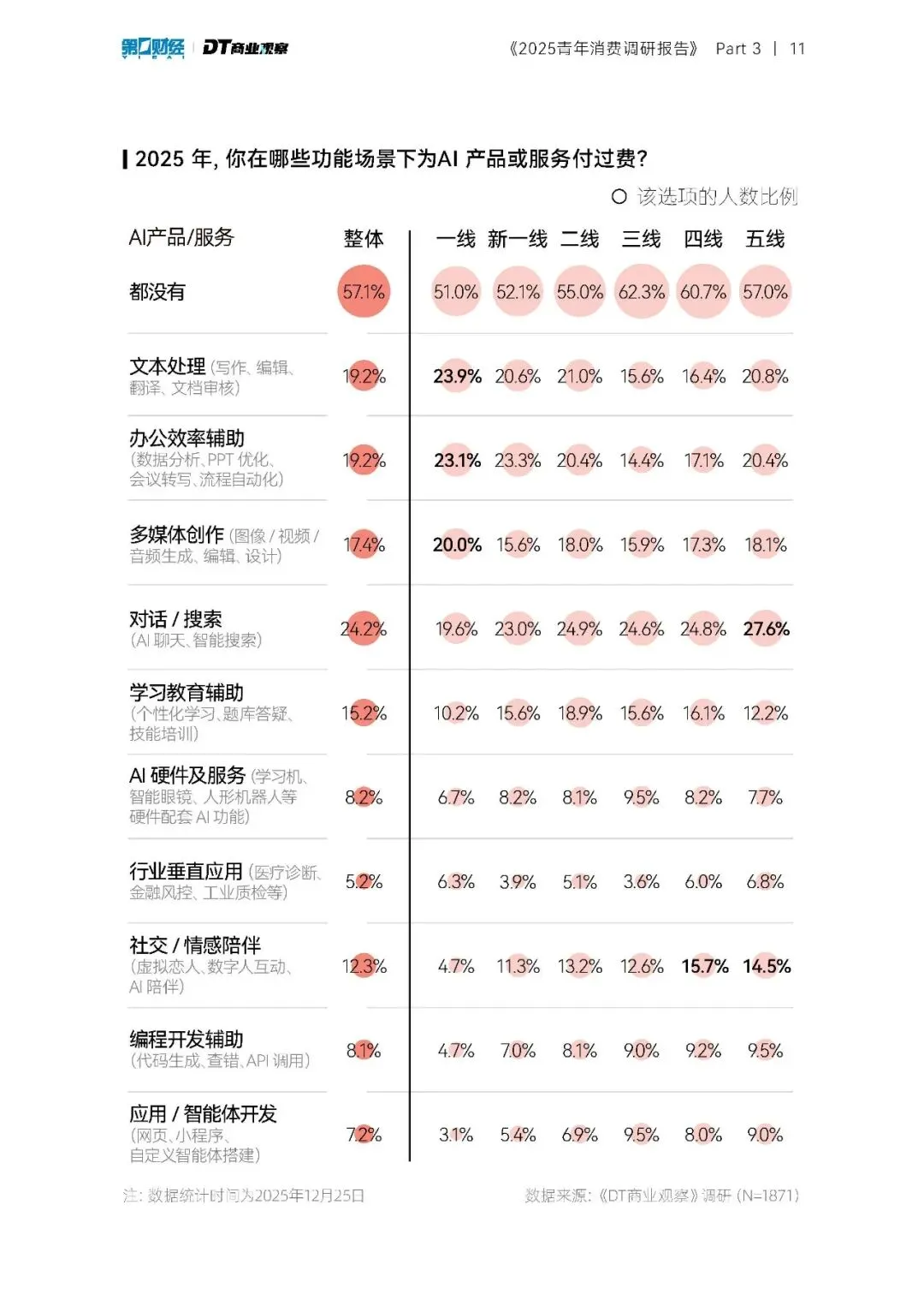 AI 消费的崛起,成为 2025 年青年消费的全新亮点,超四成受访者为 AI 产品或服务付过费,而不同城市的青年,对 AI 的消费需求呈现出截然不同的走向。一线城市的青年,把 AI 变成了打工搭子,AI 文本处理、办公效率辅助、多媒体创作成为他们付费最高的三大 AI 服务,写周报、做 PPT、剪视频,能让 AI 做的绝不自己动手,AI 成为提升工作效率的重要工具。下沉市场的青年,则把 AI 当成了聊天搭子,AI 对话,搜索成为他们付费最高的 AI 服务,五线城市的付费比例达到 27.6%,四五线城市对社交,情感陪伴类 AI 的付费意愿也远高于其他线级城市,15.7% 的四线青年、14.5% 的五线青年为这类 AI 服务付费,在生活中无处倾诉的情绪,都可以向 AI 倾诉。