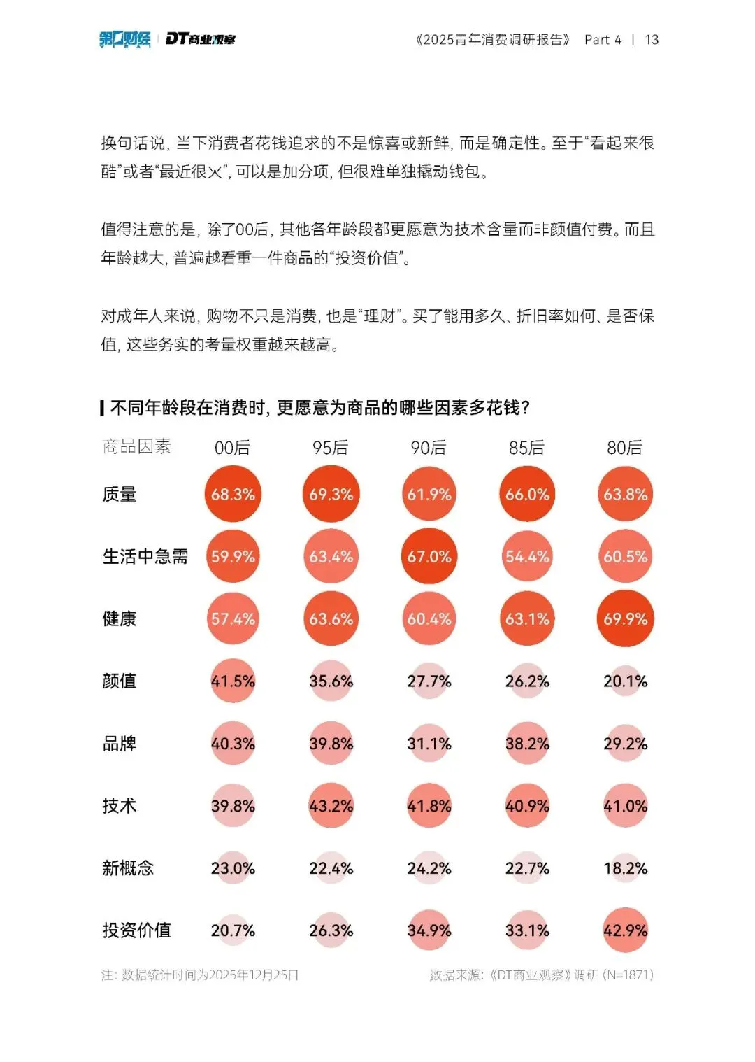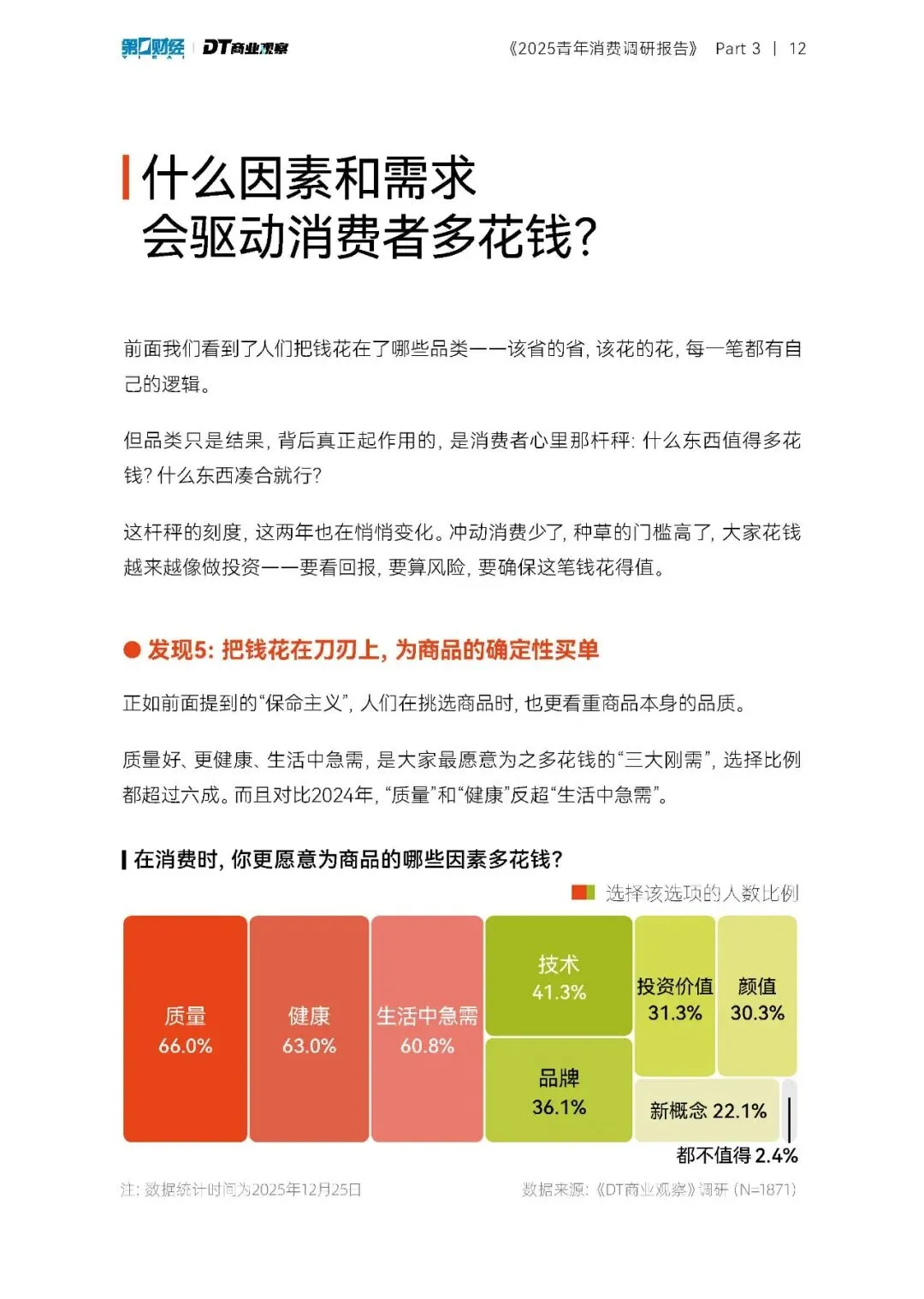 当青年们确定了花钱的方向,驱动他们多花钱的因素,也发生了本质变化。冲动消费越来越少,种草的门槛越来越高,花钱越来越像做投资,要看回报,要算风险,要确保花得值。质量、健康、生活中急需,成为青年最愿意为之多花钱的三大刚需,且质量和健康首次反超生活中急需,成为消费决策的核心考量。青年消费不再追求惊喜和新鲜,而是为商品的确定性买单,看起来很酷、最近很火的标签,已经很难单独撬动他们的钱包。