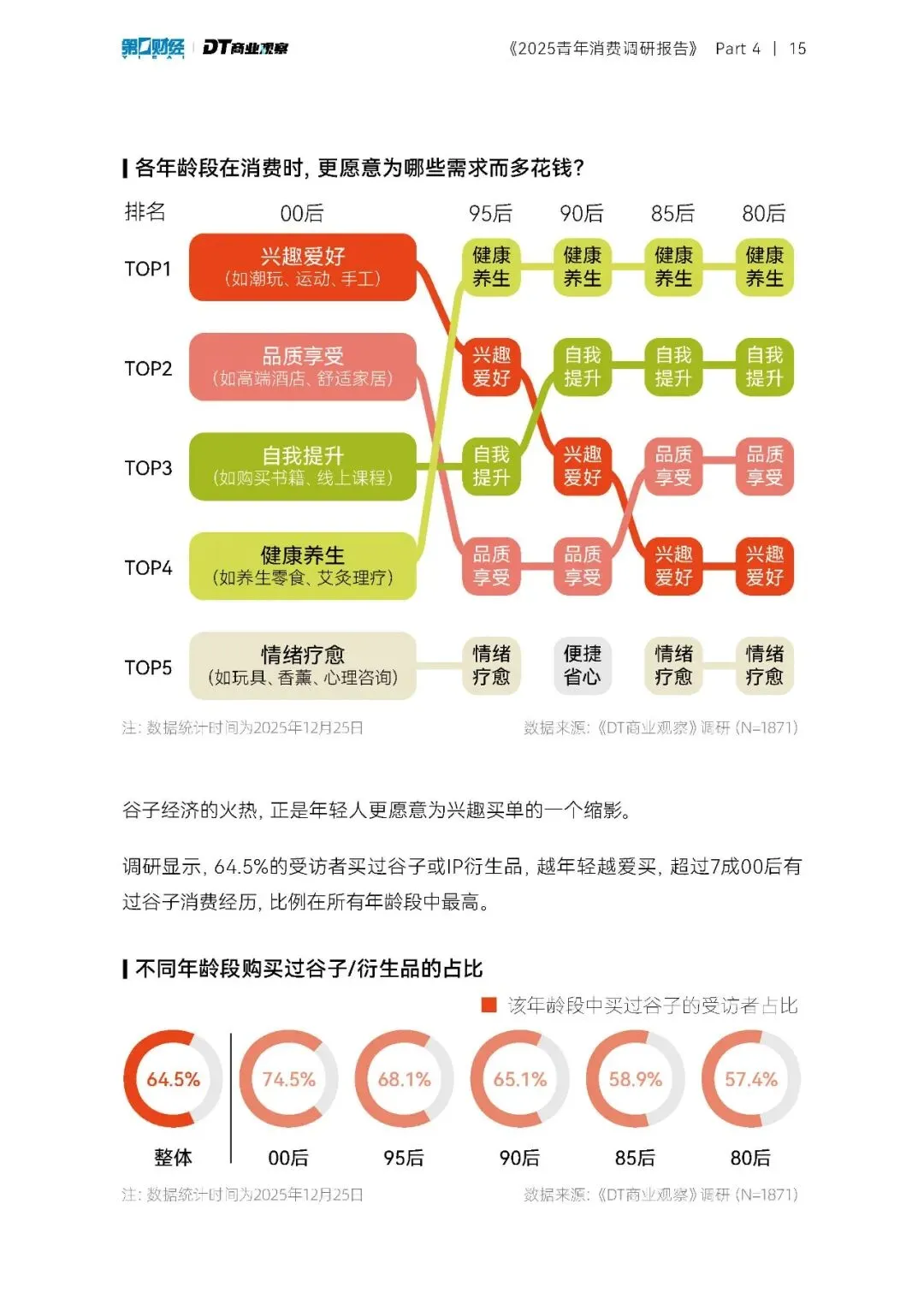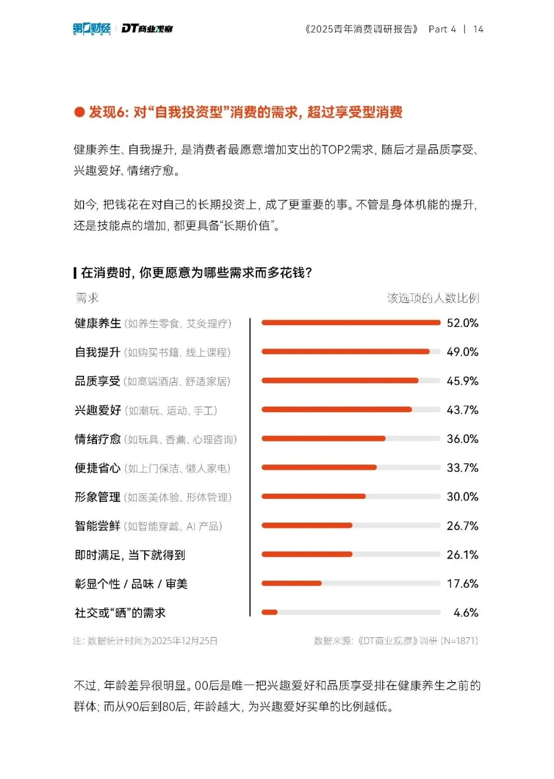 在消费需求层面,自我投资型消费全面超过享受型消费,健康养生和自我提升成为青年最愿意增加支出的两大需求,品质享受、兴趣爱好、情绪疗愈则排在其后。把钱花在自己身上,做长期投资,成为青年消费的主流理念,身体机能的提升和技能点的增加,比单纯的享乐更具吸引力。年龄差异在消费需求上同样明显,00 后是唯一把兴趣爱好和品质享受排在健康养生之前的群体,而从 90 后到 80 后,年龄越大,为兴趣爱好买单的比例越低。