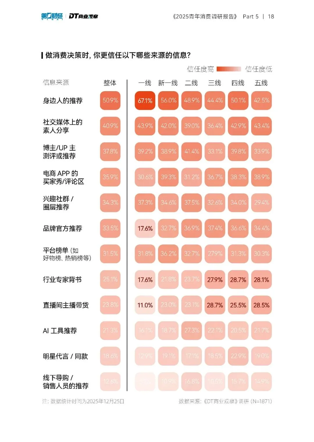 消费决策的信息来源,也在 2025 年完成了大洗牌,真实个体的分享,成为青年最信任的消费参考。48.9% 的青年最相信身边人的推荐,一线城市这一比例更是达到 67.1%,然后才是社交媒体上的素人分享、博主测评、电商买家秀,比华丽的广告宣传更有说服力,闺蜜的油痘肌护肤推荐,远比专家的笼统建议更能打动人心。AI 工具推荐的信任比例达到 16.1%,已经超过了明星代言的 19.1% 和线下导购的 12.6%,虽然 AI 尚未成为主流决策依据,但已经成为青年搜集消费资料、辅助消费决策的重要工具。
