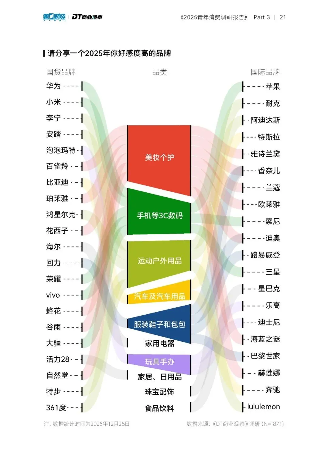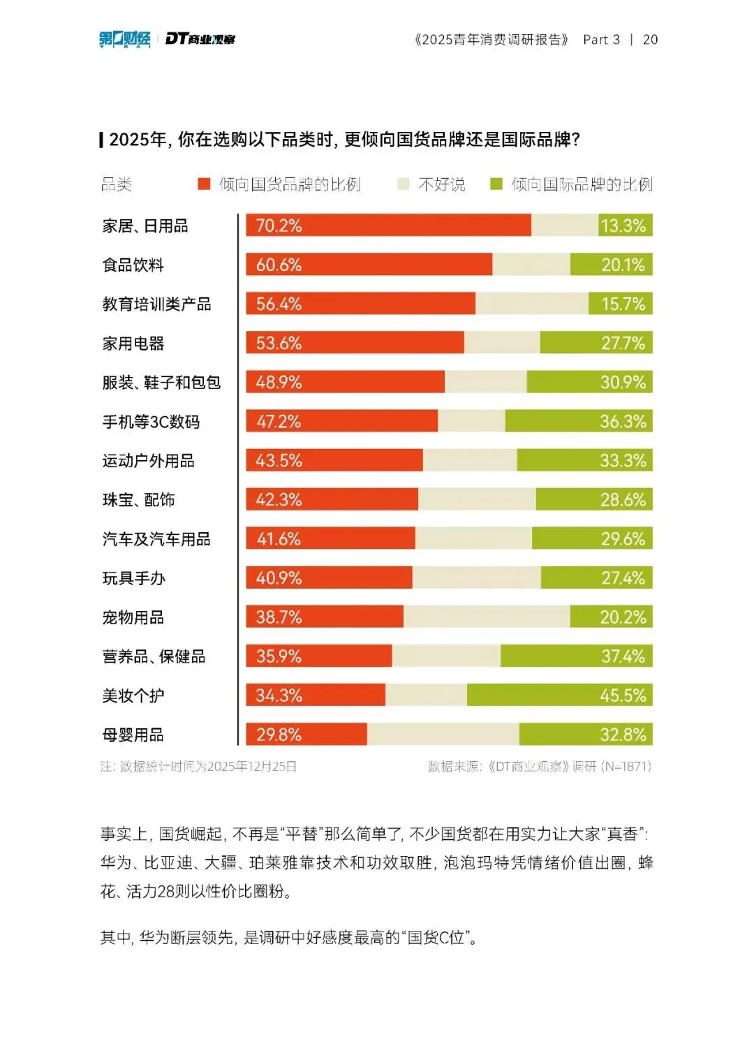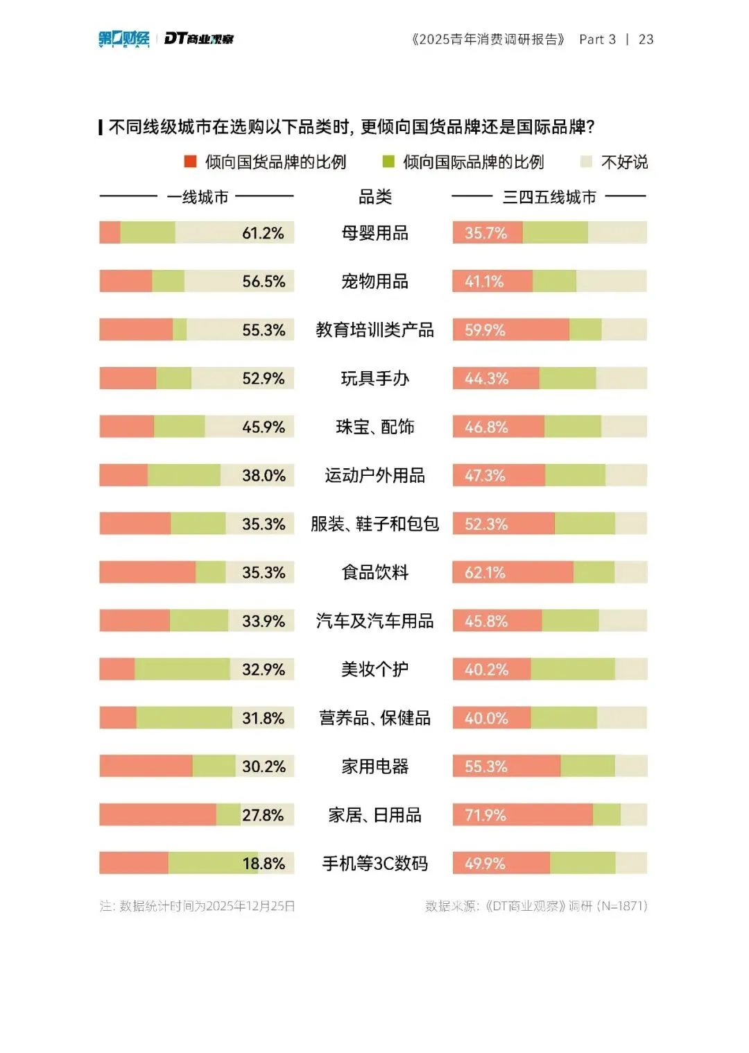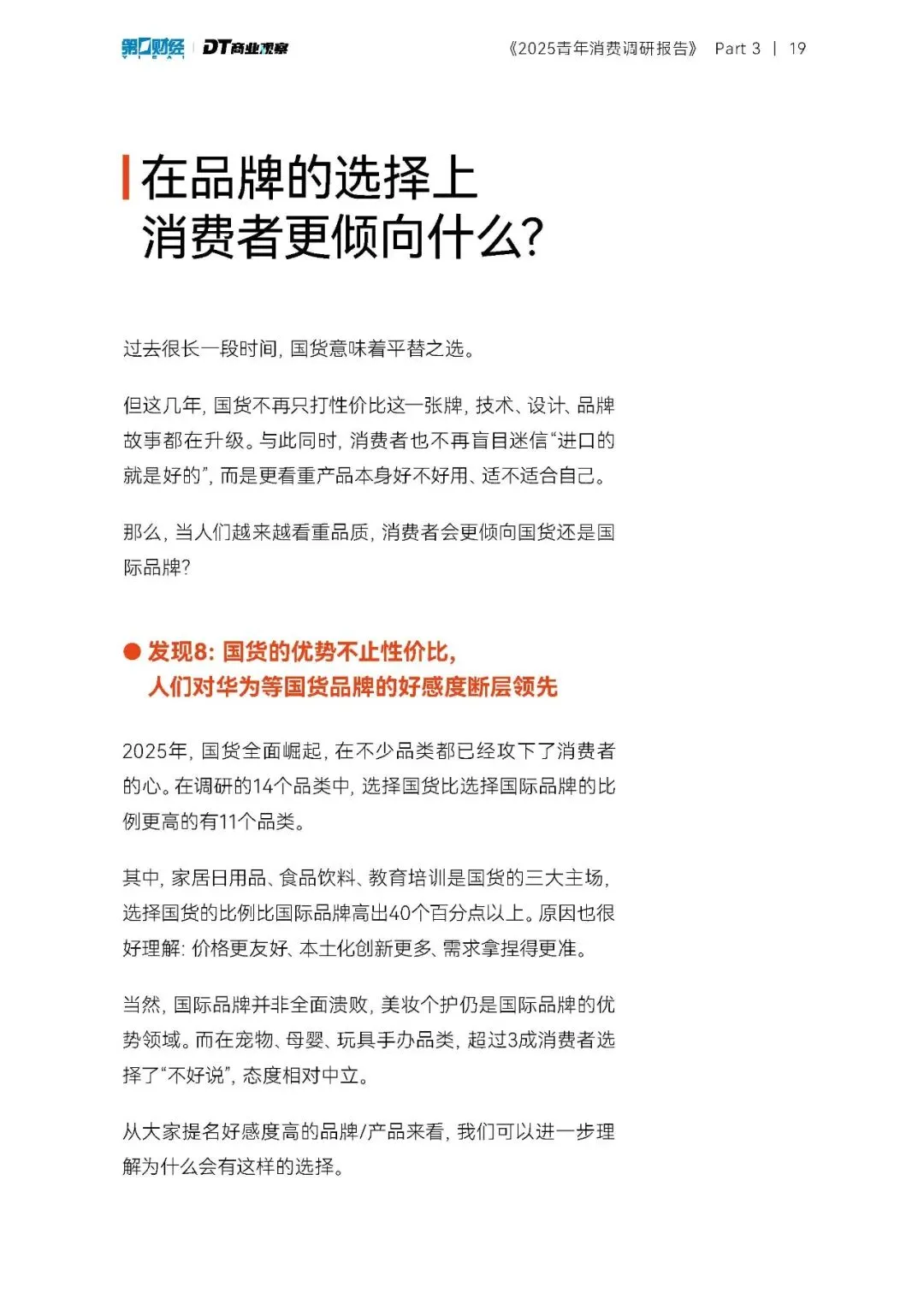 在品牌选择上,国货在 2025 年迎来全面崛起,曾经的平替标签,早已被技术、设计、品牌故事所取代。在调研的 14 个品类中,有 11 个品类选择国货的比例高于国际品牌,家居日用品、食品饮料、教育培训成为国货的三大主场。国货的优势,在于更友好的价格、更贴合本土的创新、更精准的需求拿捏,而国际品牌并非全面溃败,美妆个护仍是其优势领域,45.5% 的青年在选购美妆个护时更倾向国际品牌,国货这一比例为 34.3%。宠物、母婴、玩具手办品类,超三成消费者选择不好说,对国货和国际品牌保持中立态度。