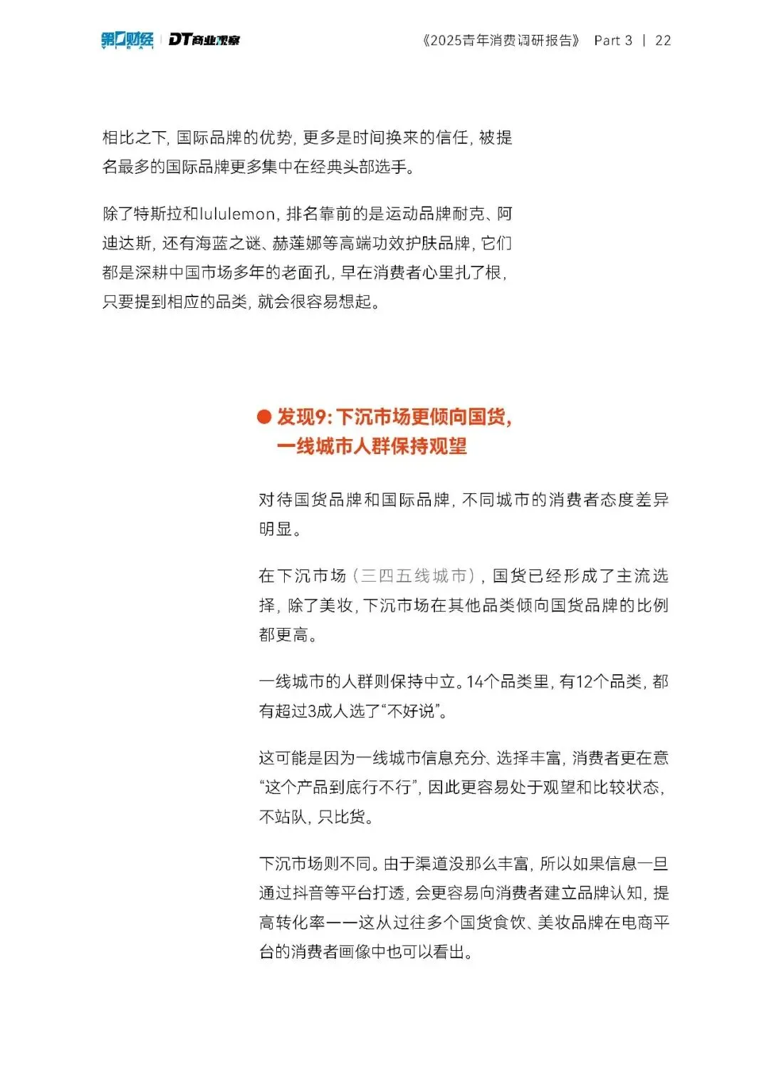 城市线级决定了青年对国货的接受度,下沉市场成为国货的消费主力,一线城市则保持观望。三四五线城市的青年,除美妆品类外,在其他所有品类中都更倾向国货品牌,而一线城市的青年,在 14 个品类中有 12 个品类超三成选择不好说。下沉市场的信息渠道相对集中,一旦品牌信息通过平台打透,就能快速建立品牌认知,提升转化率,而一线城市的青年信息充分、选择丰富,更在意产品本身的品质,不站队只比货,成为他们的消费准则。