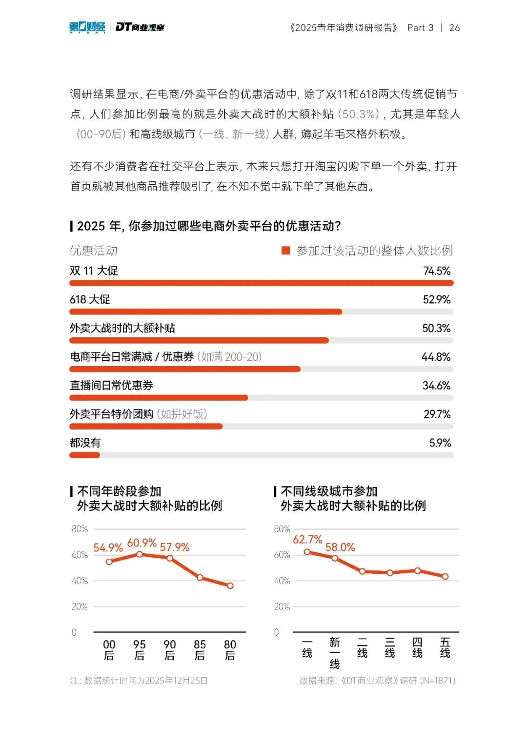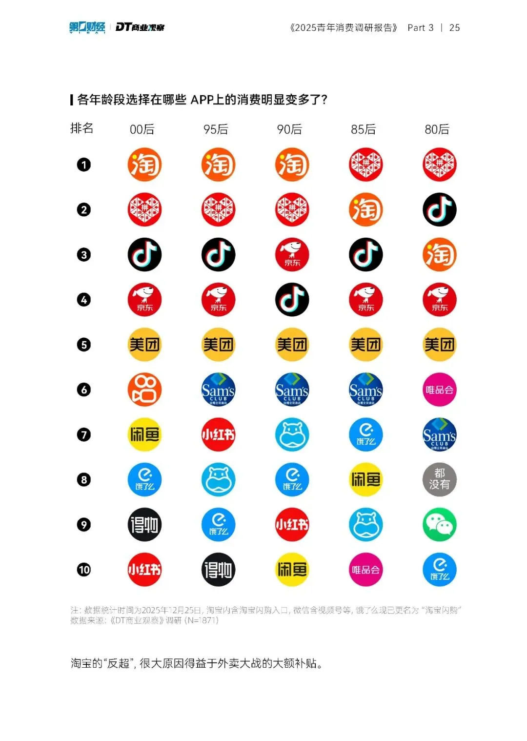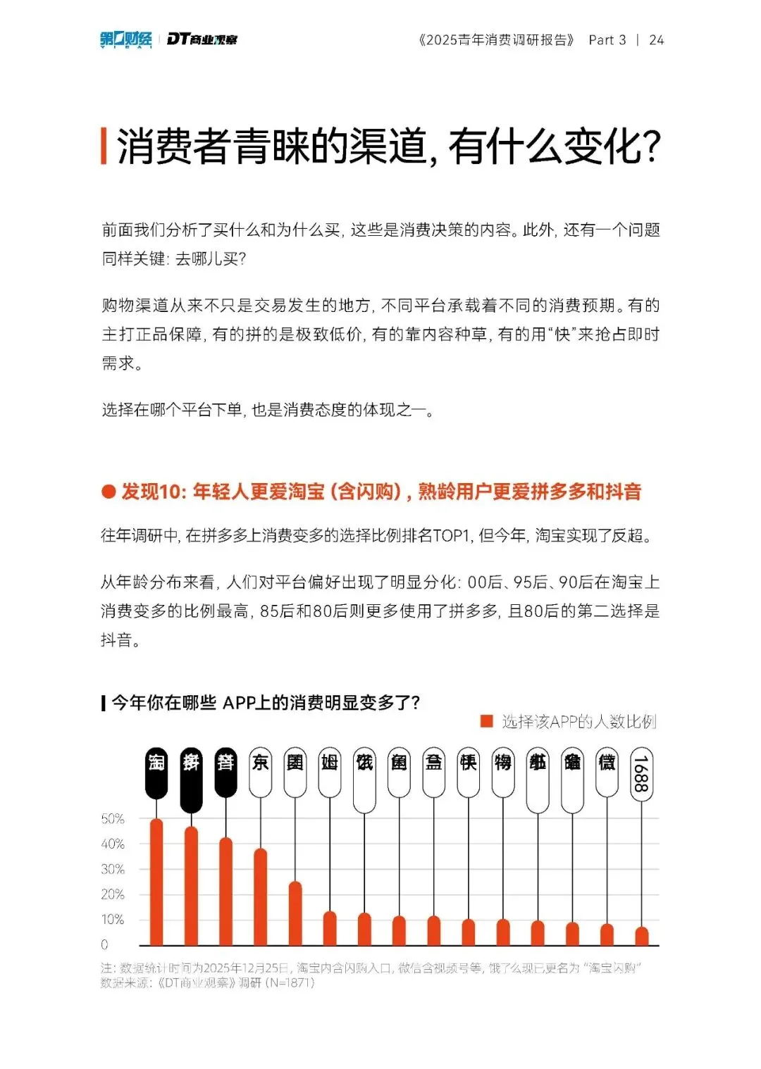 消费渠道的选择,同样呈现出年龄和城市的双重分化,线上线下各有偏好,平台选择各有不同。往年稳居第一的拼多多,在 2025 年被淘宝反超,年轻人成为淘宝的核心消费群体,00 后、95 后、90 后在淘宝上消费变多的比例均为最高,而 85 后和 80 后则更偏爱拼多多,80 后的第二大消费平台是抖音。年轻人和高线级城市青年,薅羊毛的热情格外高涨。不少青年本想打开淘宝闪购买外卖,却被首页推荐吸引,不知不觉完成了其他消费,外卖入口成为拉动消费的重要抓手。