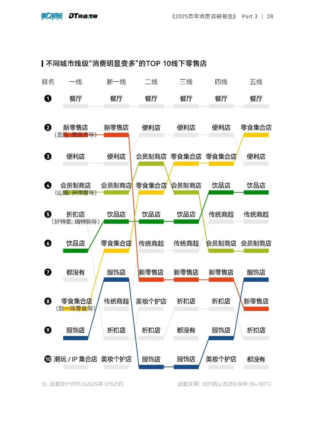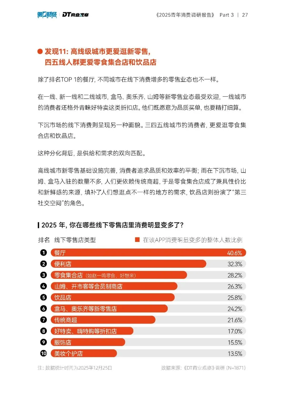 线下消费的业态选择,也因城市线级不同而差异明显。餐厅成为所有城市青年线下消费增加最多的业态,选择比例达到 40.6%,便利店以 32.3% 的比例位居第二。高线级城市的青年,更爱逛新零售业态,一线、新一线、二线城市的青年,对盒马、奥乐齐等新零售店的消费增加比例更高,一线城市的青年还格外青睐好特卖等折扣店,既追求品质,也不忘精打细算。三四五线城市的青年,线下消费则更倾向零食集合店和饮品店,28.2% 的青年增加了零食集合店消费,25.8% 增加了饮品店消费,零食集合店填补了下沉市场对性价比和新鲜感的需求,饮品店则成为青年的第三社交空间,满足了他们的社交需求。