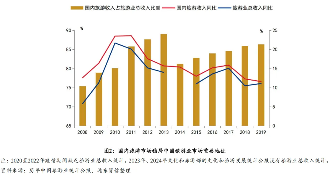 国内旅游长期成为我国旅游业的核心组成部分。图2显示,2011年以来,国内旅游收入占旅游业总收入比重一直处于80%以上水平,其收入增速快于旅游业整体收入增速,国内旅游板块是引领中国旅游业增长的核心动力。