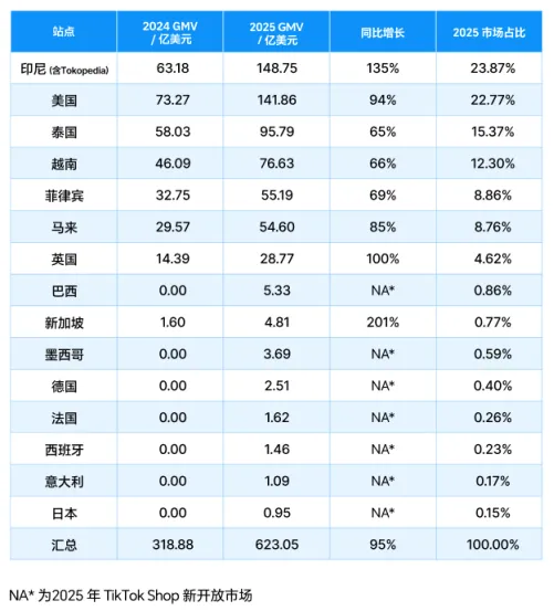“在全球电商增长明显放缓的背景下,TikTok Shop正以高出行业约5倍的速度持续夸张,成为全球零售体系中最具确定性的增长引擎!2026年,TikTok电商将在东南亚各主要国家全面超越Shopee,成为区域内规模最大,增长最快的第一电商品平台。”全球电商增速集体放缓,赛道内卷加剧,而TikTok Shop却逆势跑出“加速度”,成为全球零售市场中最亮眼的增长极。2026TikTok电商白皮书重磅发布,不仅披露了平台最新的增长数据,更核心的是指明了一个关键趋势:TikTok电商的机会仍在,但野蛮生长的时代已过,全新的增长逻辑已然成型。今天我们就深度拆解这份白皮书,读懂2026TikTok电商的核心经营思路。一、逆势增长!TikTok Shop成全球电商核心增量在行业平均增速遇冷的背景下,TikTok Shop的增长数据堪称惊艳。2025年,TikTok Shop在全球15个站点预计实现623.05亿美元GMV,同比增长95.5%,增速约为行业平均水平的5倍。机构更是预测,平台总GMV有望未来突破1500亿美元,实现5年150倍的增长奇迹,其中美国市场2026年GMV预计将达240亿美元。从各站点表现来看,成熟市场持续领跑,新兴市场快速起量:印尼(含Tokopedia)、美国稳居GMV前列,英国同比增长达100%,新加坡更是实现201%的超高增速,而巴西、墨西哥、德国等2025年新开放市场也已完成初步布局,展现出巨大的发展潜力。亮眼的数据背后,是TikTok电商从流量红利向价值红利的转变,2026年入局TikTok电商,核心问题早已不是“要不要做”,而是“如何做对”。二、趋势重构:告别野蛮生长,深耕本土+打造品牌是核心TikTok电商的平台结构正在发生本质变化,从早期的供给扩张、流量释放,全面进入以品牌力、履约能力、精细化运营为核心的深耕阶段,成交规模正加速向具备长期经营能力的主体集中。在店铺类型上,各市场的本土店、品牌店占比持续提升,美国市场GMV TOP100店铺中品牌型店铺占比84%,东南亚这一比例更是高达95%;2025年全球品牌型店铺GMV占比已提升至55%,品牌信任、稳定供应链成为提升转化的关键。同时,GMV Max等机制的完善,让平台资源分配更看重转化表现与履约稳定性,生态向高质量方向升级。这也决定了2026年的全球布局策略需要“因地制宜”:成熟市场重点做结构升级与履约能力建设,新兴市场则把握窗口期,在规则完善中搭建长期经营基础,拒绝单一增长路径的简单复制。TikTok电商的成交品类呈现头部集中特征,美妆个护、女装与女士内衣、手机与数码三大核心品类,合计贡献全球TOP10类目GMV的58.5%。而时尚配饰、家居用品凭借高增速成为重要增量,2025年同比增速分别达147%、131.6%,成为商家布局的新风口。图片来源:2026TikTok电商白皮书但白皮书揭示了一个核心规律:决定商品规模上限的,从来不是类目本身,而是商品的。是否有可反复拆解的卖点、是否具备视觉呈现张力、能否支撑长期多场景的内容供给,才是商品从“可卖”到“规模化卖爆”的关键。功能差异决定成交基础,内容表达能力则决定放大效率。从头部商品样本来看,各市场GMV高位的商品,均具备“高密度内容供给、多角色参与”的特征:短视频供给量达数万条级别,带货达人数千至上万,且短视频GMV占比维持在70%-85%,直播更多承担加速转化的功能。爆款从来不是单条高转化内容的偶然,而是可持续内容供给的必然。四、流量逻辑:短视频筑认知,直播做放量,二者协同才是关键在TikTok电商的流量体系中,短视频和直播并非简单的渠道选择,而是承担着完全不同的战略角色,读懂二者的“第一性原理”,才能实现流量价值最大化。短视频的核心价值是塑造认知、沉淀心智,而非单条视频的即时GMV。成熟的美国市场中,达人发布的短视频数量约为商家自制的23倍,庞大的内容体量形成了持续的口碑沉淀,稳定成交正是建立在这种高密度内容供给之上。无论是成熟市场还是新开放市场,带货短视频的供给量均呈现稳步增长趋势,成为内容沉淀的核心载体。直播的核心价值是成交放大、积累信任,增长逻辑高度依赖“规模×时长”的稳定输出。美国市场中,单场时长超70小时的直播可实现约40万美元GMV,家电类目头部直播间甚至连续直播超280小时;数据还显示,中低客单价区间,直播时长与GMV显著正相关,中高客单价则需要更长周期直播释放信任势能。整体策略上,短视频负责认知构建、爆款孵化,直播负责强化信任、稳定放量,广告投放则围绕完整内容周期分阶段协同,成交结果是内容、直播、投放节奏共同作用的产物。五、达人是基本盘,AI是提效辅助,核心竞争力回归人TikTok电商的生态中,达人始终是核心的内容生产力和成交驱动者,而AI则成为内容生产的重要提效工具,二者相辅相成,但核心竞争力最终回归到人对市场和内容的理解。2025年,全球联盟达人数量超925万人,全年产出5.79亿条短视频、1.16亿场直播,合计贡献329.98亿美元GMV,占平台总GMV的53%,联盟达人GMV在各市场均占据重要份额。从成交形态来看,达人短视频依旧主导成交,美国、印尼等核心市场中,达人短视频GMV均显著高于直播,高频可持续的视频内容更易形成长期稳定的成交结构。与此同时,AI工具在内容生产环节快速普及,部分运营团队中AI生成/辅助的内容占比达70%-90%,大幅降低了剪辑、脚本的生产成本,也降低了内容创作的入场门槛。但白皮书明确指出,AI仅提升执行效率和产能规模,并未带来转化效率的量级跃升,也无法替代人与人之间的情感连接和