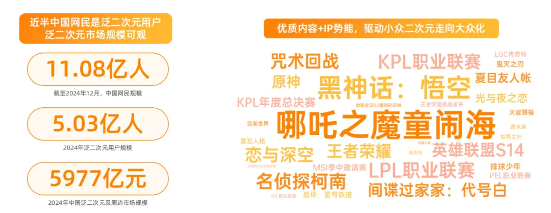 2024年泛二次元用户规模达5.03亿,接近中国网民总数的一半,泛二次元及周边市场规模达5977亿元,头部IP成为破圈关键推手。