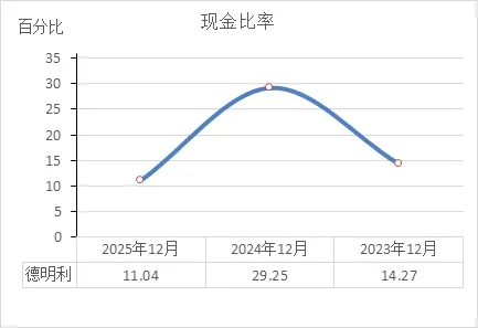 安全线常识:现金比率通常认为20%以上才算比较安全(手里有2毛现金对付1块钱债)。德明利2024年好不容易达标,2025年直接腰斩,掉到11%的危险区。
