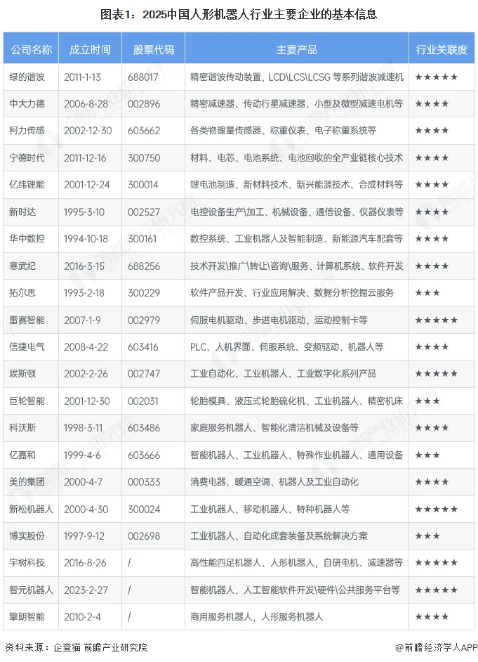 人形机器人是中国培育新质生产力、推进“智造强国”战略的核心赛道,可在工业生产、民生服务、特种作业等场景替代或辅助人力,高效完成复杂任务,破解劳动力结构矛盾并赋能各行各业智能化升级。中国人形机器人行业的代表性企业包括绿的谐波、中大力德、柯力传感、宁德时代、拓尔思、雷赛智能、埃斯顿、巨轮智能、科沃斯、美的集团、宇树科技和新松机器人等,覆盖人形机器人全产业链的核心部件、控制系统、动力系统、感知系统、AI算法和整机制造六大关键环节。企查猫显示,主要企业基本信息如下: