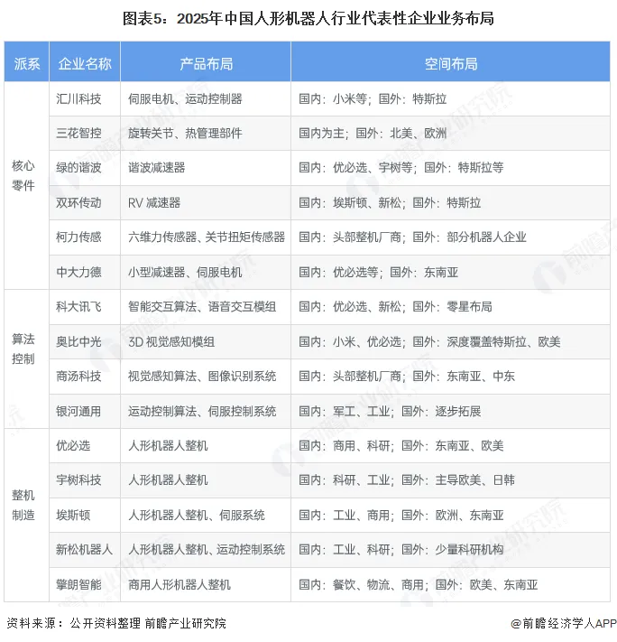 根据2025年中国人形机器人行业不同竞争派系代表性企业的业务布局可知,核心零件派系,聚焦伺服电机、减速器等关键部件,国内市场与小米、优必选等头部整机厂绑定,同时深度渗透特斯拉等海外大厂供应链;算法控制派系主攻交互、视觉感知技术,其中奥比中光海外市场较为成熟,对欧美整机厂商进行了深度覆盖;整机制造派系分场景布局,国内聚焦商用、科研等领域,宇树科技主导欧美、日韩消费级市场,擎朗智能覆盖国内外餐饮、物流商用场景。