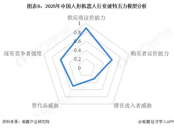 从波特五力模型的分析角度来看,目前供应商议价能力极高,核心零部件领域技术壁垒显著且头部企业垄断性强;购买者议价能力中等,人形机器人为新兴行业,实现全方面量产还需要时间的沉淀和技术的积累;潜在进入者威胁低,资金、技术与规模三重壁垒构筑高准入门槛;替代品威胁中等,专用设备短期在单一场景占优,但随着应用场景的更新拓展,人形机器人长期替代潜力大;现有竞争者强度偏高,核心零件、算法控制、整机制造三大派系内部分化竞争,头部企业集中效应凸显,另有部分企业跨界涉足人形机器人行业,使竞争加剧。