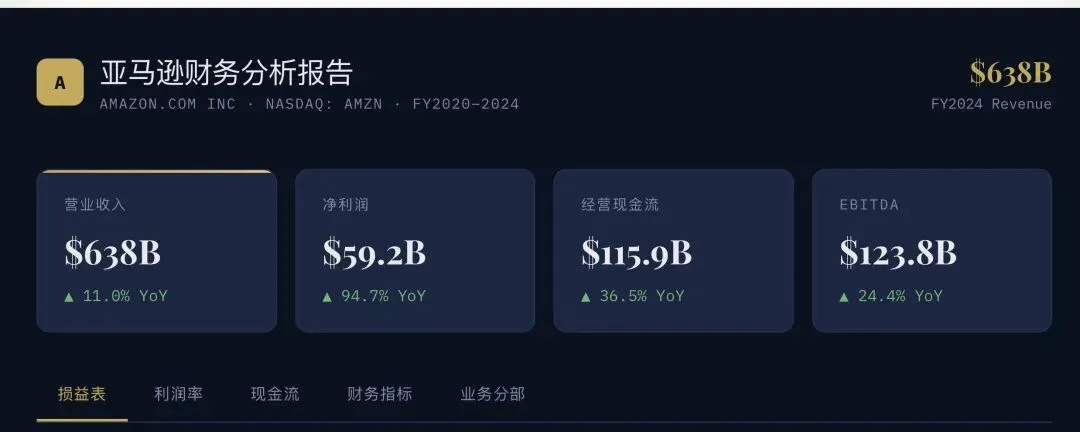 现金流强劲 — 经营现金流从2021年的463亿美元持续增长至2024年超过1000亿美元以上水平 ,AWS高利润率是核心驱动力