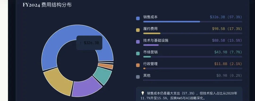 ③ 技术与基础设施 — 2023年技术与基础设施费用达$85.6B,较上年$73.2B大幅增加 ;2024年进一步升至$88.5B,五年翻倍,是占收入比上升最快的科目(+2.8pp)。