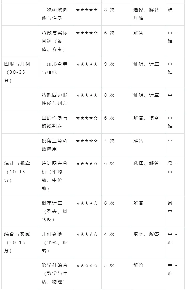 统计与概率(约 15 分):包括数据的收集整理与描述、数据分析、概率初步。这部分内容相对稳定,主要变化是强化数据分析(从图表提信息、做决策)、增加抽样调查合理性考查、概率结合生活;降低概率复杂计算(如排列组合)要求,删除脱离实际的试题。
