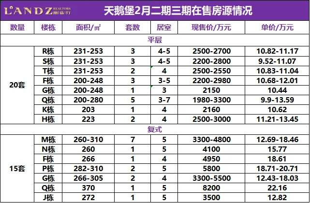 ①二期三期平层户型(200-280㎡):在售20套,挂牌总价1980-3300万,挂牌单价9.52-13.45万/㎡;