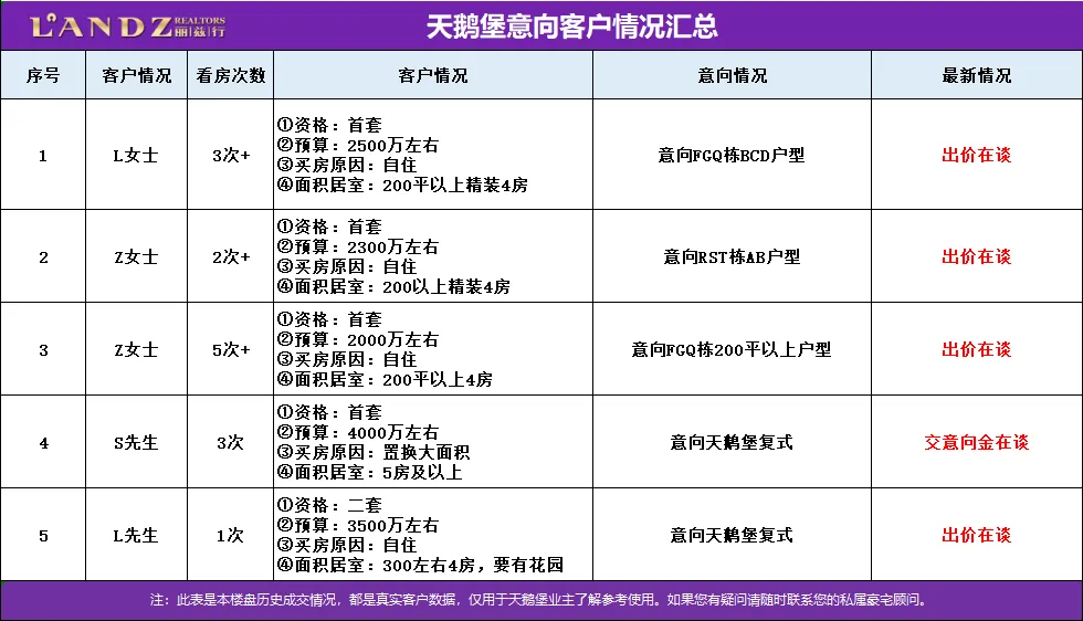 以上客户是我司到访天鹅堡社区的高意向真实出价客户,多次看过天鹅堡且对天鹅堡某个户型明确出过价,有合适的房源当下就能买天鹅堡。如果您家房子考虑出售,我们团队会尽最大的努力推广,如果还需要了解更多客户的详细情况,欢迎您详询您身边的豪宅顾问。
