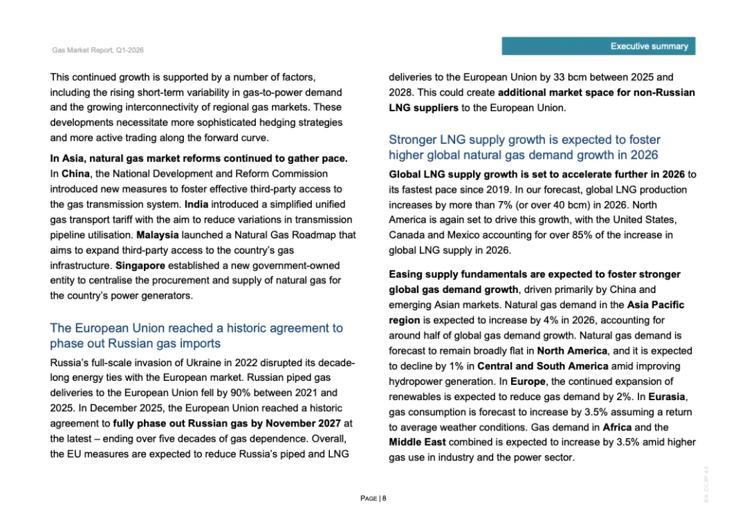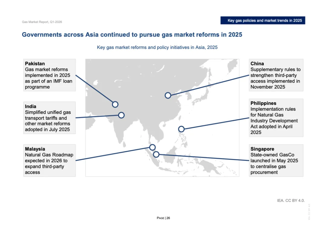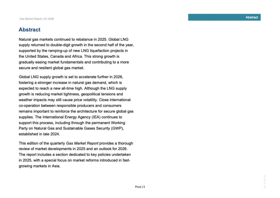 2026年供给侧扩张将进一步加速。预计全球LNG产量增长超过7%,新增逾400亿立方米,其中北美贡献85%以上。亚洲需求预计增长4%,贡献全球需求增量的一半,中国需求增速或达5%,新兴亚洲增长约7%;欧洲需求或下降2%,北美基本持平,欧亚增长3.5%。在供应加速释放与市场改革深化背景下,全球天然气市场正由“紧平衡”转向“宽平衡”,价格中枢或趋于稳定,但地缘政治与极端天气仍将放大阶段性波动,市场结构性重构已成长期趋势。