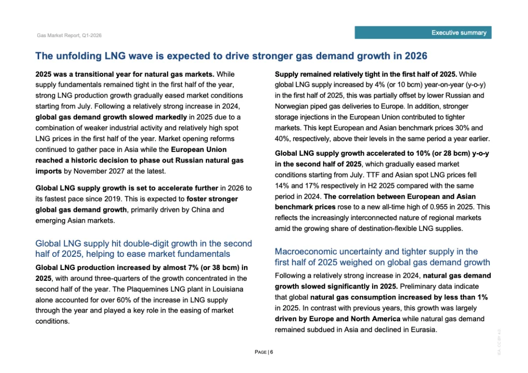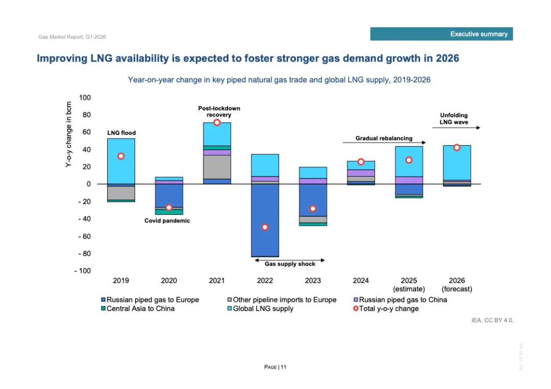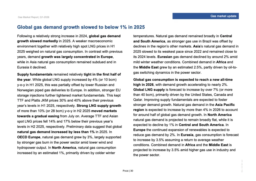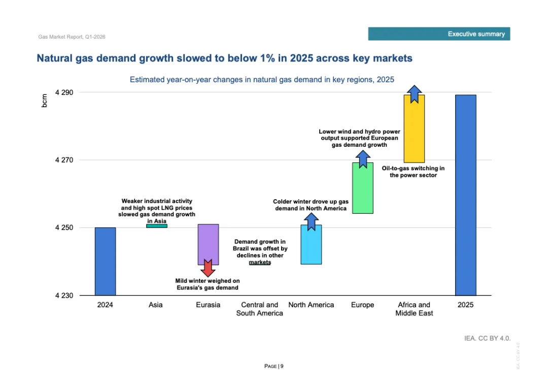 区域分化特征显著。2025年欧洲天然气需求增长3%,主要因风电、水电偏弱推动发电用气上升;北美需求增长约1%,寒冬推升建筑供暖负荷;欧亚地区需求下降约2%;亚洲整体需求基本持平,中国需求增长约1%,但LNG进口同比下降14%,约150亿立方米,显示国内产量增长6%以上及俄气管道气满负荷输送形成替代效应。非洲与中东合计需求增长2.5%,油转气推动电力用气回升。