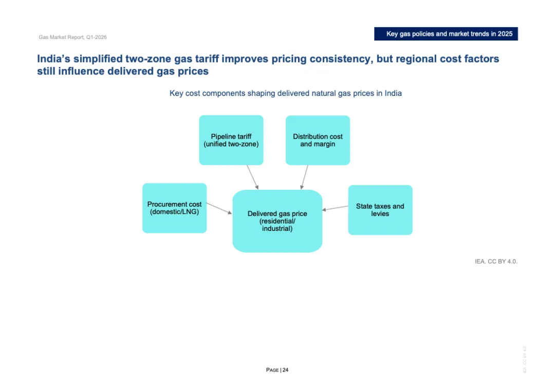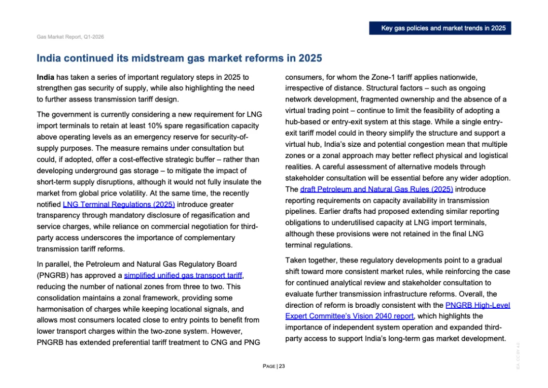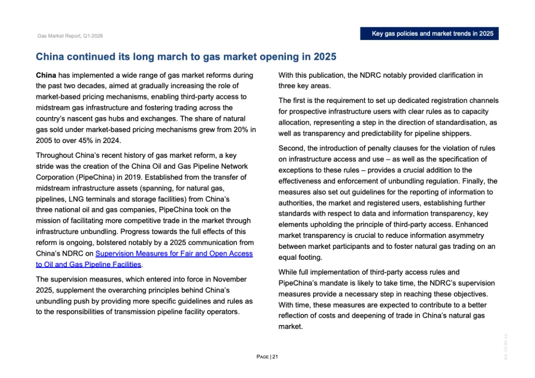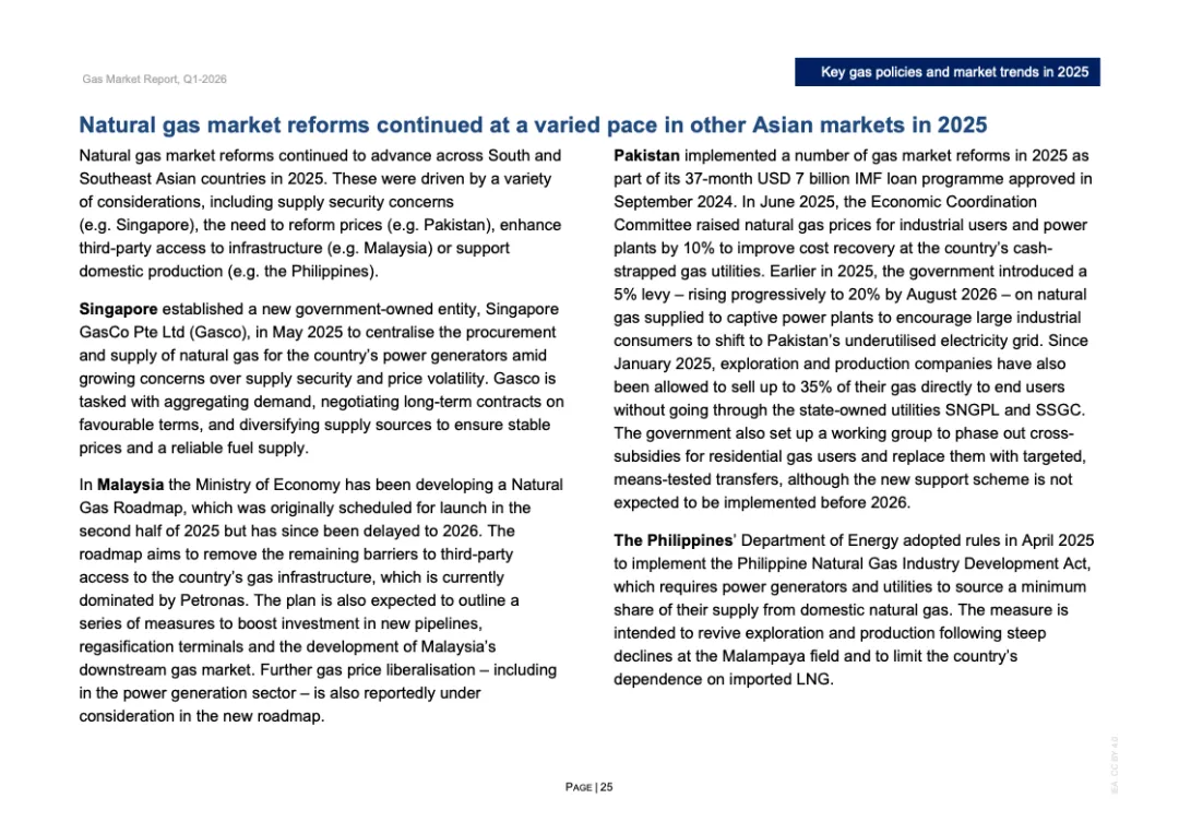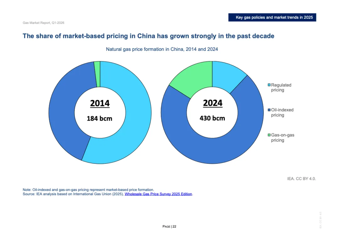 区域分化特征显著。2025年欧洲天然气需求增长3%,主要因风电、水电偏弱推动发电用气上升;北美需求增长约1%,寒冬推升建筑供暖负荷;欧亚地区需求下降约2%;亚洲整体需求基本持平,中国需求增长约1%,但LNG进口同比下降14%,约150亿立方米,显示国内产量增长6%以上及俄气管道气满负荷输送形成替代效应。非洲与中东合计需求增长2.5%,油转气推动电力用气回升。