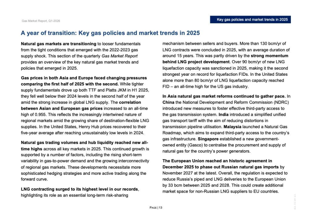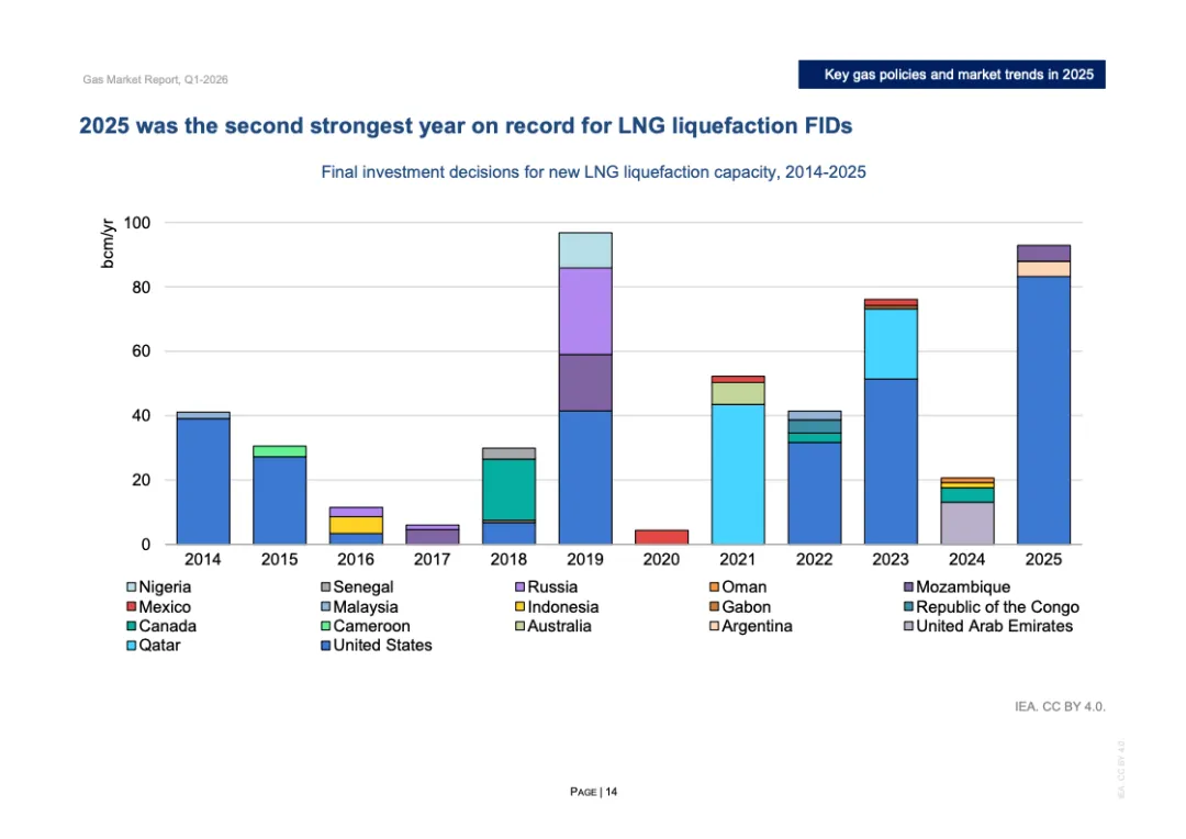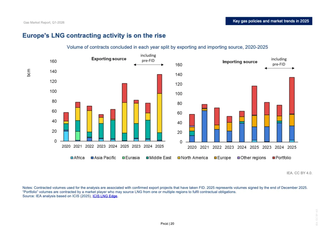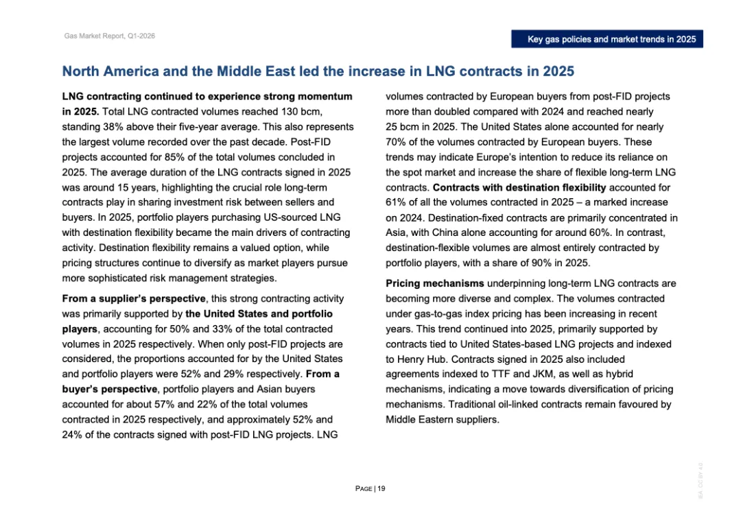 投资与合约周期同步升温。2025年全球新增LNG液化项目最终投资决定规模超过900亿立方米/年,为2019年以来第二高水平,其中美国占逾800亿立方米/年。全年新签LNG合约规模达1300亿立方米/年,创十年新高,平均期限约15年,61%为目的地灵活合约。欧洲买家签约量接近250亿立方米,同比翻倍,显示降低现货依赖的战略转向。