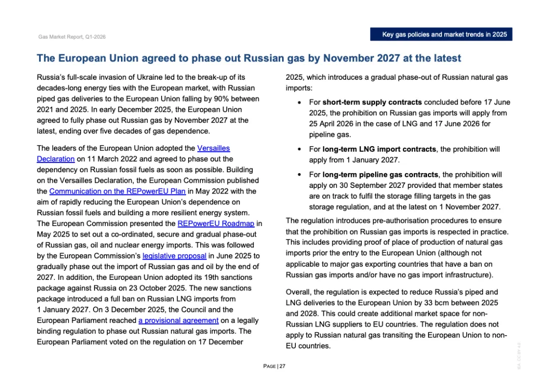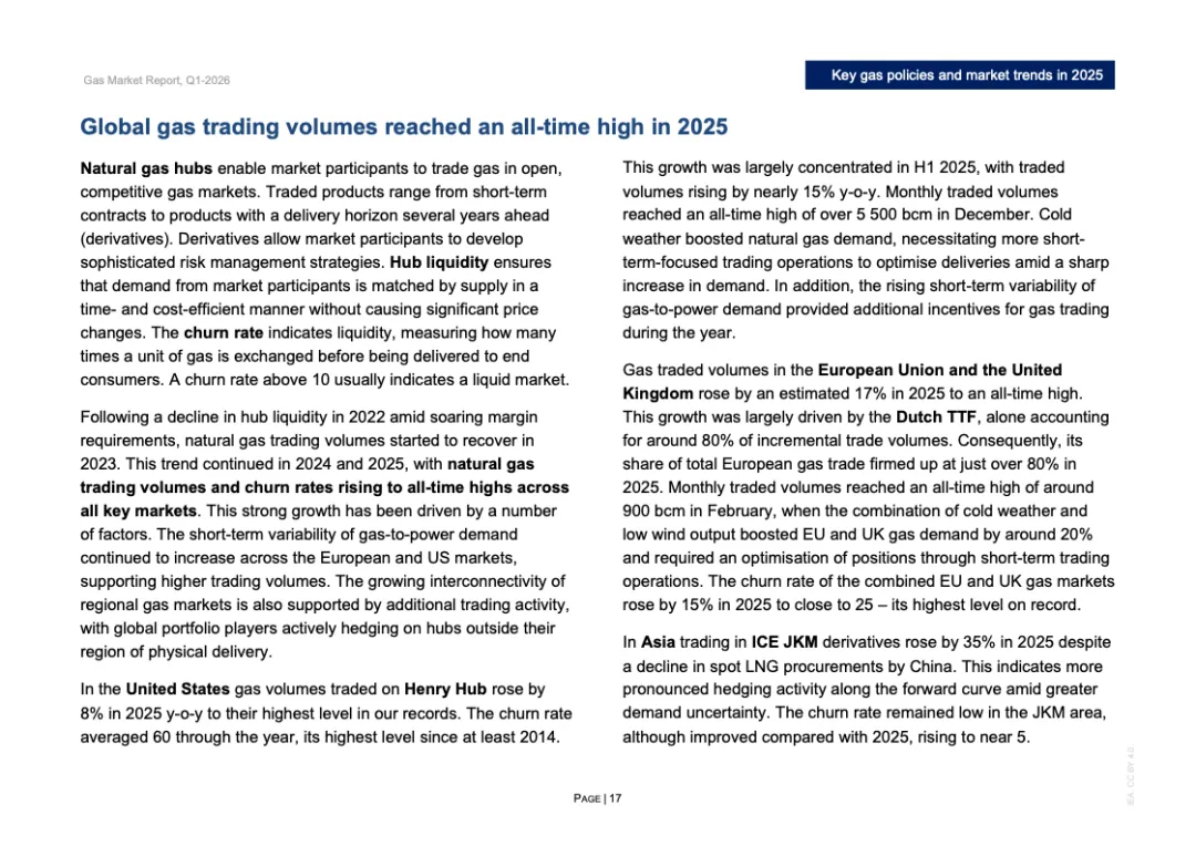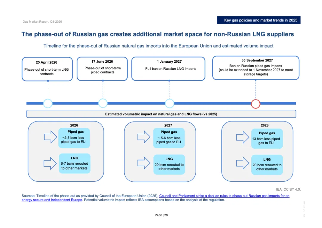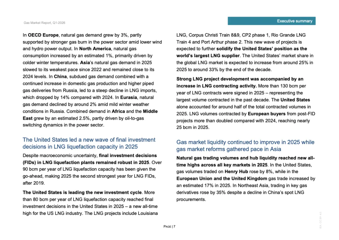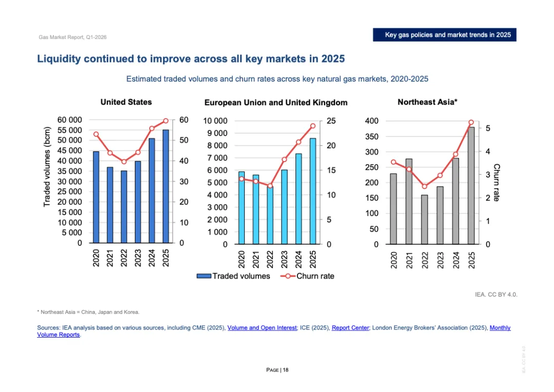 投资与合约周期同步升温。2025年全球新增LNG液化项目最终投资决定规模超过900亿立方米/年,为2019年以来第二高水平,其中美国占逾800亿立方米/年。全年新签LNG合约规模达1300亿立方米/年,创十年新高,平均期限约15年,61%为目的地灵活合约。欧洲买家签约量接近250亿立方米,同比翻倍,显示降低现货依赖的战略转向。
