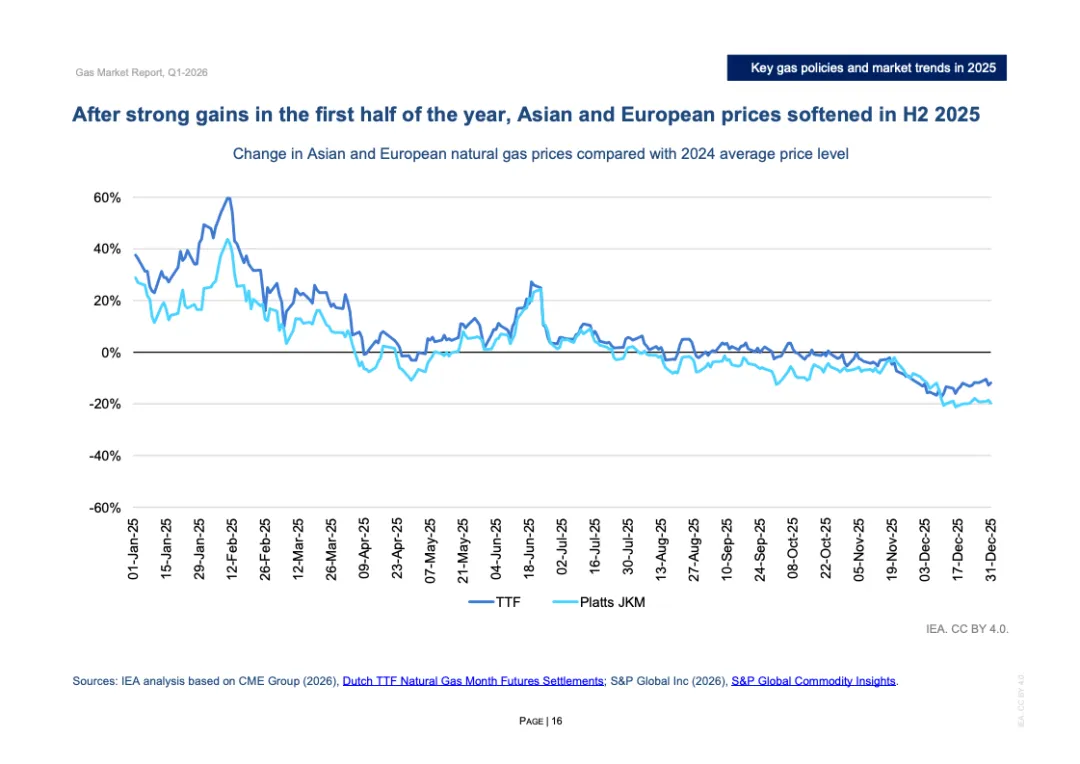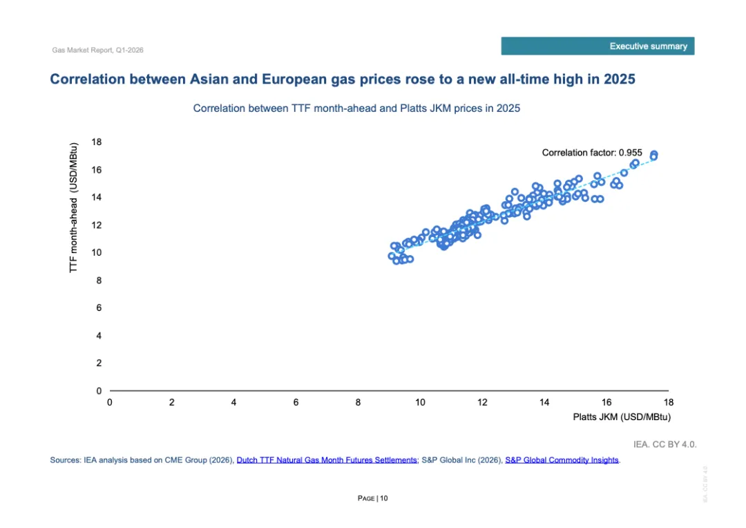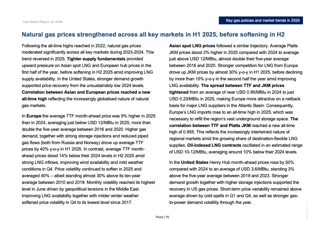 价格体系联动性明显增强。2025年TTF与JKM月度价格相关系数升至0.955,创历史新高,区域市场高度一体化。欧洲全年TTF均价接近12美元/百万英热单位,同比上涨9%;JKM均价亦在12美元上方,同比上涨2%。两地价差从2024年的0.95美元缩窄至0.23美元,跨区域套利空间收敛,现货流向更趋灵活。美国Henry Hub价格同比上涨50%至3.6美元,回归五年均值上方。
