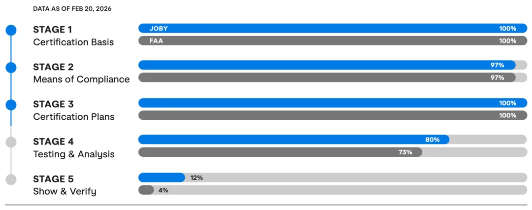 截至2026年2月20日,JOBY披露:Stage 1/2(认证基础、符合性方法)在JOBY与FAA侧均接近完成(100%/97%),Stage 3(认证计划)JOBY 80%、FAA 73%,而Stage 4(测试与分析)JOBY 12%、FAA 4%。
