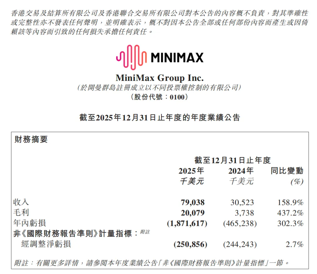 2026年3月2日,港交所上市AI大模型企业MiniMax(2026年1月挂牌)披露了2025年度业绩公告——这是其上市后的首份年报,也是全球大模型行业为数不多的公开财报样本。截至2025年12月31日,MiniMax全年实现收入7903.8万美元,同比增加158.9%;毛利2007.9万美元,同比增加437.2%;年内亏损18.72亿美元,经调整净亏损2.51亿美元。这份财报呈现出鲜明的“两极分化”特征:营收规模实现爆发式增长,展现出强劲的商业化潜力;但账面亏损同步扩大,叠加外部竞争加剧,其平台化转型之路仍面临多重考验。本文将从数据拆解、经营质量、战略布局、风险挑战四大维度,结合行业背景,对这份财报进行专业深度解读。一、核心数据拆解:营收暴增与亏损高企的“反差感”