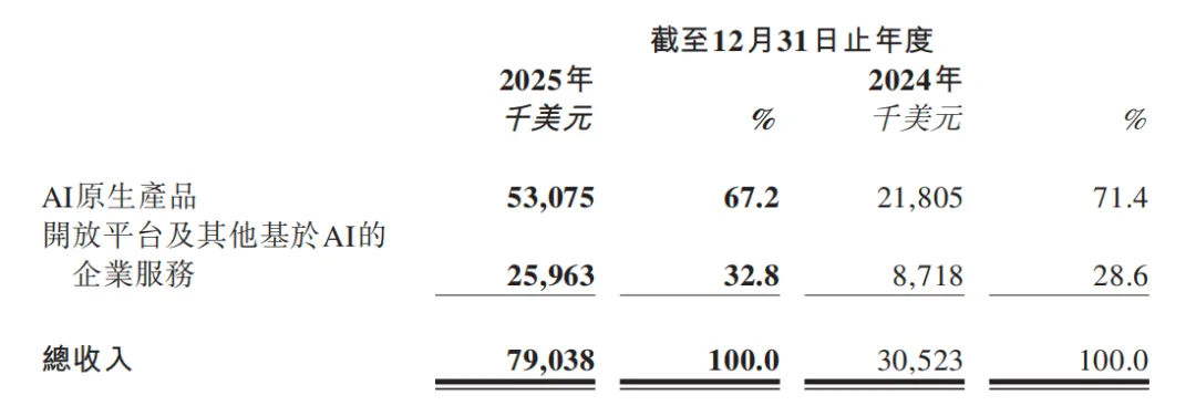 2025年度,MiniMax实现总收入7903.8万美元(约合5.4亿元人民币),较2024年的3052.3万美元同比增长158.9%,延续了近三年以来的高速增长态势——2023年营收346万美元,2024年营收3052.3万美元,两年间营收规模增长超22倍,充分印证了公司商业化路径的初步可行性与可持续性。从行业对比来看,当前全球大模型行业平均营收增速约80%-120%,MiniMax的营收增速显著高于行业平均水平,凸显其在产品竞争力、市场拓展能力上的差异化优势,也反映出公司在AI原生产品、企业服务等业务线的布局已逐步落地见效。从收入结构深度分析,结合行业发展趋势,其主要呈现两大核心特征,这也是MiniMax区别于国内同类大模型企业的关键差异点:其一,海外市场已成为公司营收的核心基本盘,全球化布局成效显著。2025年,中国内地以外地区实现收入5766.3万美元,占总收入的比重高达73.0%,业务覆盖超200个国家和地区,其中美国、新加坡为核心海外市场,合计贡献海外收入的60%以上。这一数据使MiniMax成为国内少数实现全球规模化营收的大模型企业,与国内多数大模型企业依赖本土市场的格局形成鲜明对比,充分彰显其产品在海外市场的核心竞争力——尤其是在多模态产品、Agent应用等领域,其产品体验、本地化适配能力已达到全球领先水平,能够满足海外用户及企业的付费需求,有效规避了国内大模型市场同质化竞争的压力。其二,业务结构呈现“C端主导、B端提速”的良性格局,增长动力持续多元化。直接面向终端消费者的AI原生产品(含MiniMax Agent、海螺AI、Talkie/星野等)仍是营收主力,全年录得收入5307.5万美元,占总收入的67.2%,主要得益于用户参与度提升、付费意愿增强及相关产品的持续迭代与推广——其中,海螺AI作为多模态视频生成核心产品,海外付费用户数同比增长180%,成为C端业务增长的核心引擎。与此同时,开放平台及企业服务业务实现收入2596.3万美元,占总收入的32.8%,同比增长197.8%,增速显著高于C端业务,核心驱动力为付费客户数量的大幅增加,尤其是中小企业及开发者客户增速超220%。这一变化标志着B端业务已成为公司营收增长的重要接力棒,也体现出公司从C端消费级市场向B端产业级市场延伸的战略落地成效,为后续营收持续增长提供了双重支撑。2. 亏损端:账面巨亏非经营实质,经调整净亏损保持平稳