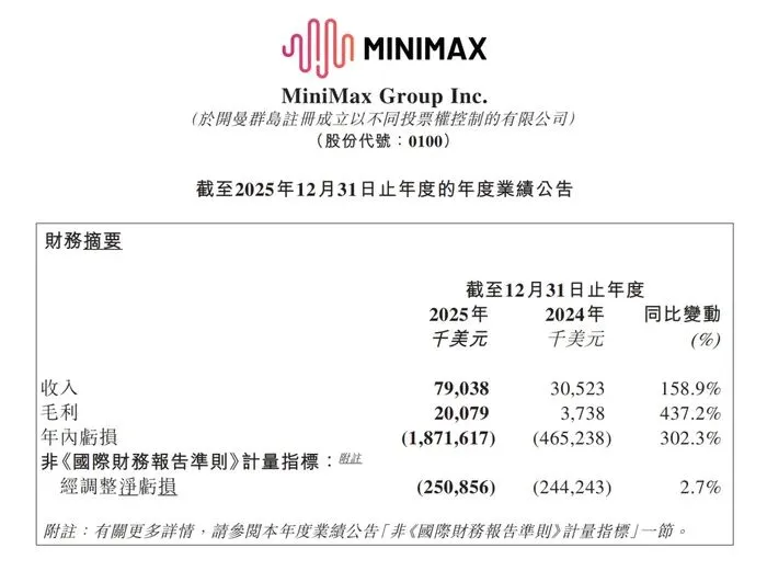 MiniMax 全年实现总收入7903.8万美元,同比大涨158.95%;毛利大幅增长437.16%至2007.9万美元,毛利率从12.25%提升至25.40%,经营效率持续改善。