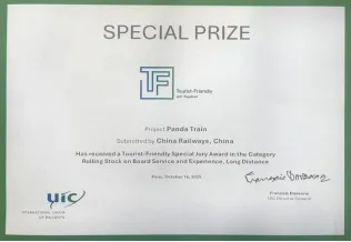 2025年,“熊猫专列”获央视 CGTN、《人民日报》等国家级媒体报道150余次、省市级官媒报道300余次,受邀参加全球熊猫伙伴大会、进博会、央视银发经济盛典等境内外文旅推介活动23场。 “熊猫旅游列车”获评全国“交通运输与旅游融合发展示范案例”和“四川省国有企业十大企业文化品牌”,被国际铁路联盟(UIC)评为“长途旅游友好型列车及车上服务(行程多于2.5小时)‘评审团特别奖’”,列车品牌效应初步形成。