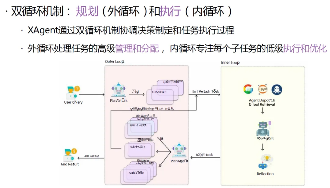 当前单体智能工具学习的前沿成果,是具备双循环机制的自主智能体框架 XAgent,其能力全面超越 AutoGPT,核心架构包括外循环与内循环两大核心: